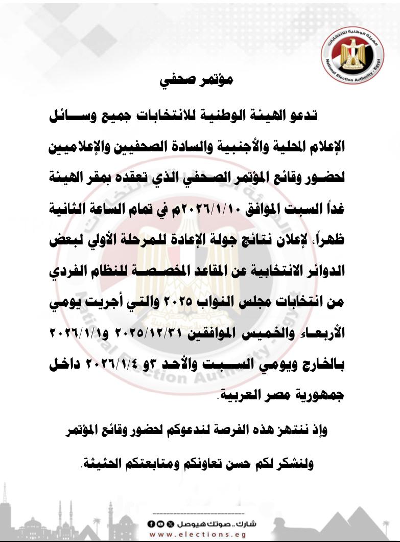 يأتي ذلك لإعلان نتائج جولة الإعادة للمرحلة الأولى لبعض الدوائر الانتخابية عن المقاعد المخصصة للنظام الفردي من انتخابات مجلس النواب 2025، التي أجريت يومي الأربعاء والخميس 31 ديسمبر و1 يناير بالخارج، ويومي السبت والأحد 3 و4 يناير داخل مصر.