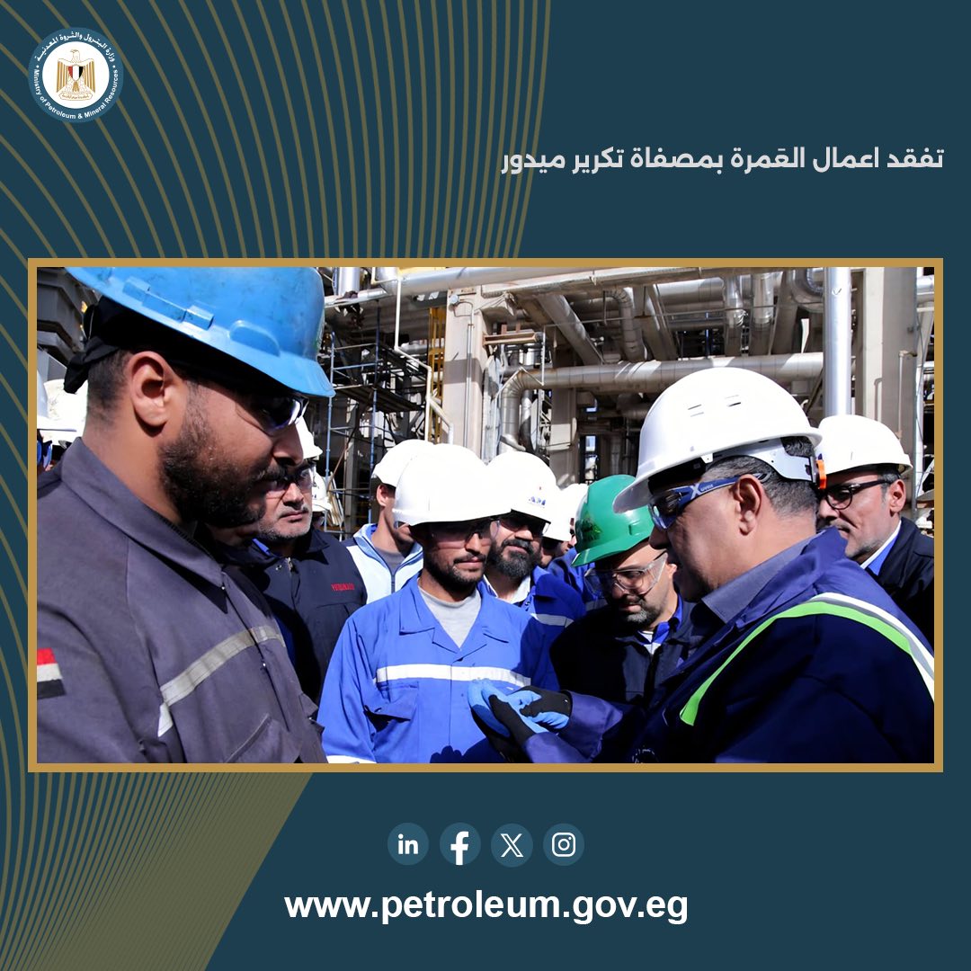 وتابع عبدالكريم، سير أعمال الصيانة المخططة لمصفاة تكرير ميدور، وتضمنت الجولة لقاء العاملين بالوحدات الإنتاجية وغرفة التحكم الرئيسية وفريق عمل شركة بترومنت العاملة بالمشروع، بحضور نواب رئيس الهيئة ورؤساء شركات ميدور وإيبروم.