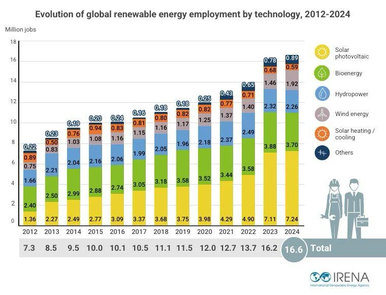 رغم وصول تركيبات الطاقة المتجددة إلى مستويات قياسية جديدة، سجلت وظائف القطاع أول تباطؤ ملحوظ في نموها، إذ ارتفعت بنسبة 2.3% فقط مقارنة بعام 2023، لتصل إلى 16.6 مليون وظيفة عالميًا خلال عام 2024.