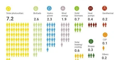وعلى مستوى التقنيات، حافظت الطاقة الشمسية الكهروضوئية على الصدارة من حيث فرص العمل، مدفوعة بالتوسع السريع في التركيبات ومصانع تصنيع الألواح. ووظف القطاع نحو 7.3 مليون شخص خلال عام 2024، استحوذت آسيا على 75% منها، فيما سجلت الصين وحدها 4.2 مليون وظيفة.
