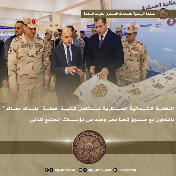 استمرارًا لجهود القوات المسلحة في تعزيز أوجه الدعم للمجتمع المدني والمساهمة في توفير الحياة الكريمة للمواطنين، استكملت المنطقة الشمالية العسكرية تنفيذ حملة "بلدك معاك" بالتعاون مع صندوق تحيا مصر وعدد من مؤسسات المجتمع المدني.