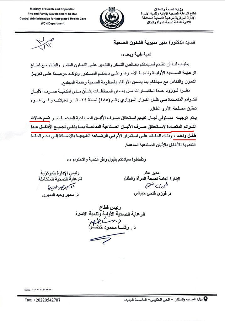 أصدرت وزارة الصحة والسكان قرارًا رسميًا بصرف اللبن المدعم لجميع حالات التوائم المتعددة، حسبما أعلن أحمد عاطف فياض مؤلف مسلسل كارثة طبيعية.