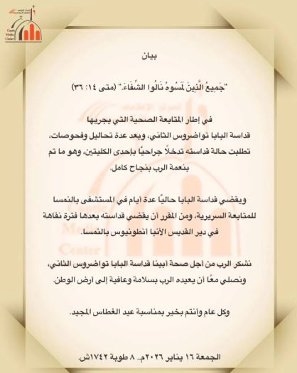 وجاء في البيان: «نشكر الرب من أجل صحة أبينا قداسة البابا تواضروس الثاني، ونصلي معًا أن يعيده الرب بسلامة وعافية إلى أرض الوطن»، وتزامن الإعلان مع عيد الغطاس المجيد، متمنين لقداسته دوام الصحة والعافية، ومشددين على الدور الروحي الكبير لقداسة البابا تواضروس في حياة الكنيسة القبطية الأرثوذكسية.