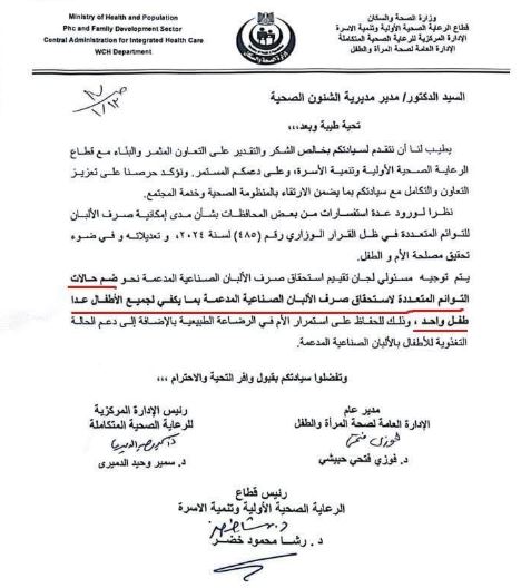 وأصدر قطاع الرعاية الصحية الأولية وتنمية الأسرة بوزارة الصحة، مستندًا رسميًا بشأن ضوابط صرف ألبان الأطفال، مُوجهًا إلى مديري مديريات الشؤون الصحية بالمحافظات، يقضي بتوجيه لجان تقييم استحقاق صرف الألبان الصناعية المدعمة نحو ضم حالات التوائم المتعددة لاستحقاق صرف الألبان المدعمة بما يكفي لجميع الأطفال عدا طفل واحد.