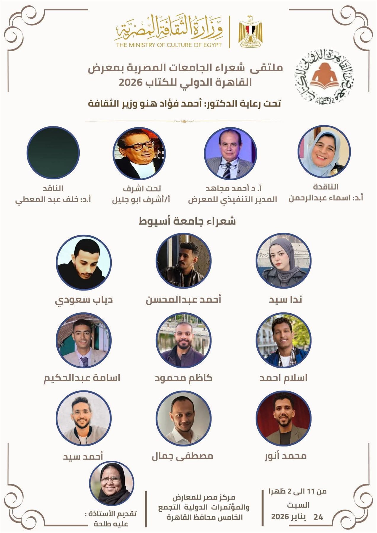 الأمسية الشعرية التي ستُقام يوم السبت 24 يناير 2026، في الساعة 11 صباحًا بقاعة ملتقى الإبداع في سرايا الندوات الثقافية بالمعرض، تأتي بدعوة من الشاعر أشرف أبو جليل، المشرف العام على ملتقى شعراء شباب الجامعات.