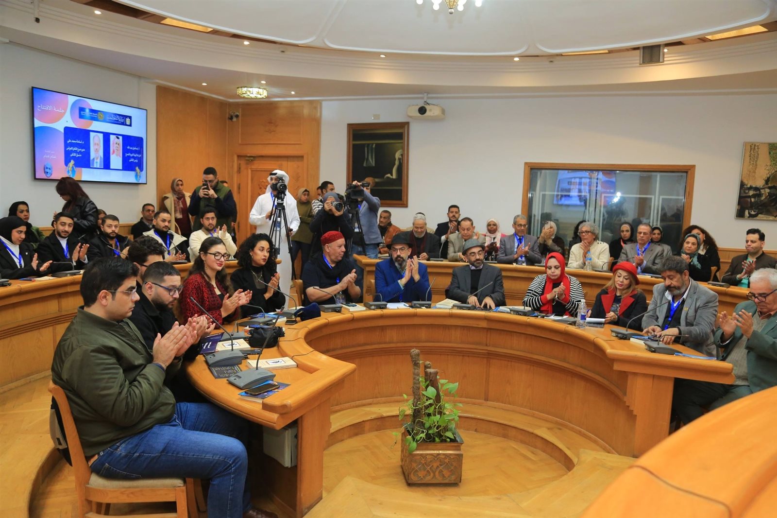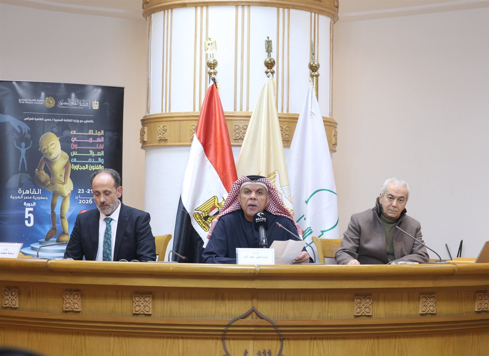 كما أشاد بدور اللجنة التنسيقية للملتقى، وبالجهود التي بذلتها الهيئة العربية للمسرح منذ إطلاق النسخة الأولى من الملتقى عام 2013، تنفيذًا للاستراتيجية العربية للتنمية المسرحية، التي أكدت ضرورة صون الفنون المؤسسة، وإحياء ما تراجع منها، وحماية الفنون المهددة بالاندثار. واستعرض مسيرة الملتقى في دوراته السابقة، وما حققته من أثر ملموس في حماية هذا الفن، وإنتاج أعمال فنية مشتركة عابرة للحدود.