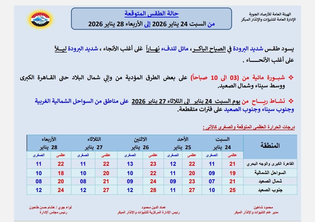 يتوقع خبراء الهيئة العامة للأرصاد الجوية أن يسود غدًا طقس شديد البرودة فى الصباح الباكر، مائل للدفء نهارًا شديد البرودة ليلًا على أغلب الأنحاء، مع استمرار فرص تكون الأتربة العالقة نهارًا على مناطق من القاهرة الكبرى، والوجه البحري وشمال الصعيد.