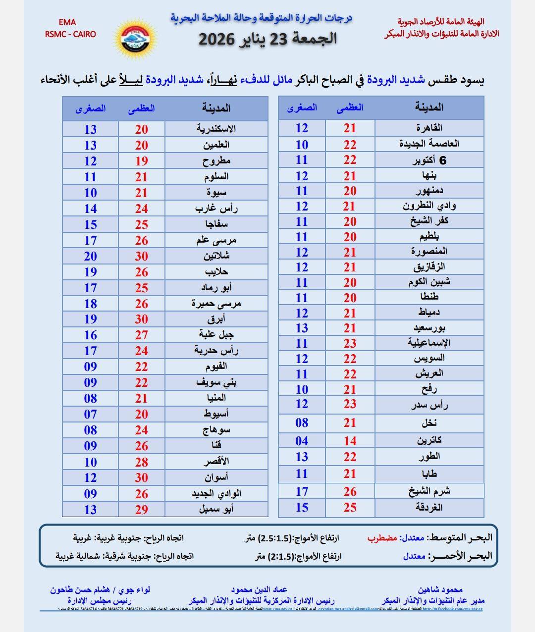 حذرت الهيئة العامة للأرصاد الجوية، المواطنين من الظواهر الجوية المتوقعة اليوم الجمعة 23 يناير 2026، حيث تشير التوقعات إلى تعرض البلاد لأجواء شديدة البرودة خلال فترات الليل وفى الصباح الباكر مائلة للدفء خلال فترات النهار️، والعظمى المتوقعة غدا فى القاهرة الكبرى 21 درجة.
