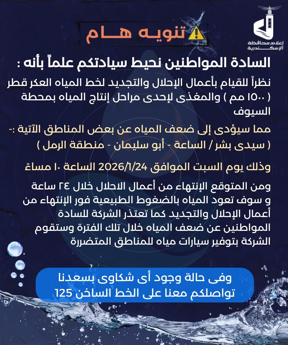 وتعتذر شركة مياه الشرب بالإسكندرية، عن ضعف المياه، خلال الفترة المذكورة، وستقوم بتوفير سيارات مياه للمناطق المتضررة على الخط الساخن 125.