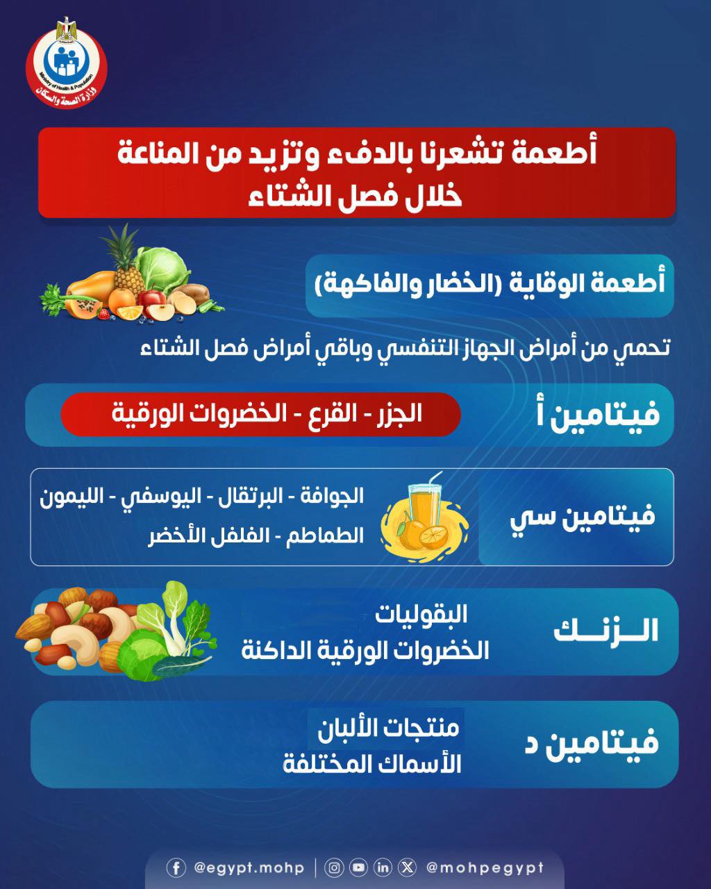 وضعت وزارة الصحة والسكان، قائمة بأبرز الأطعمة التي تشعرنا بالدفء وتزيد المناعة، خلال فصل الشتاء، لاسيما تلك التي تحمي من الإصابة بأمراض الجهاز التنفسي.