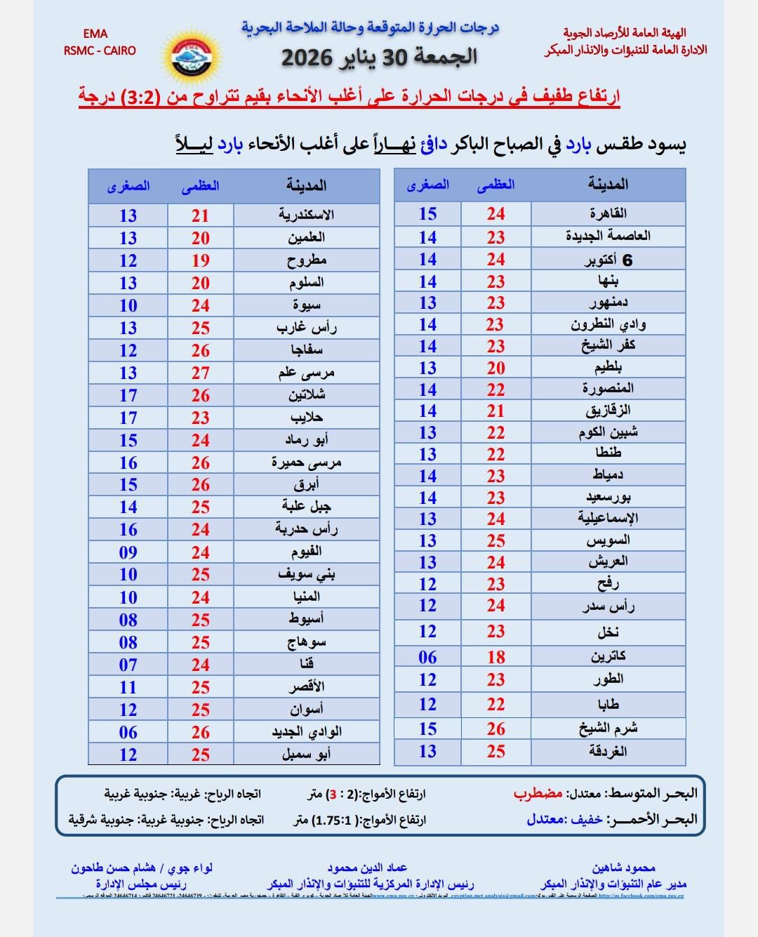 حذرت الهيئة العامة للأرصاد الجوية من حالة الطقس المتوقعة غداً الجمعة على جمهورية مصر العربية، مشيرة إلى ارتفاع طفيف في درجات الحرارة على أغلب الأنحاء بقيم تتراوح من (3:2) درجات.