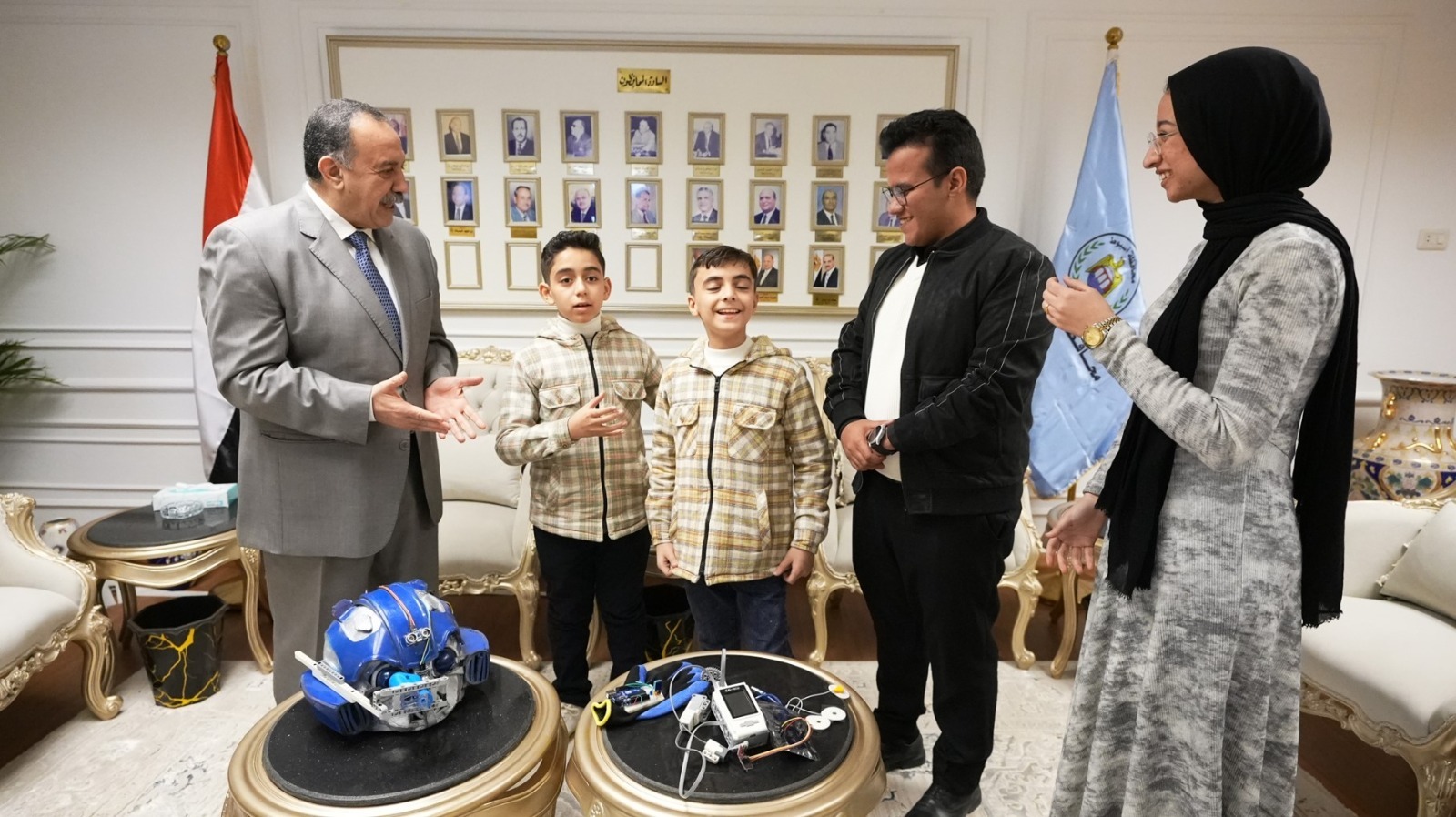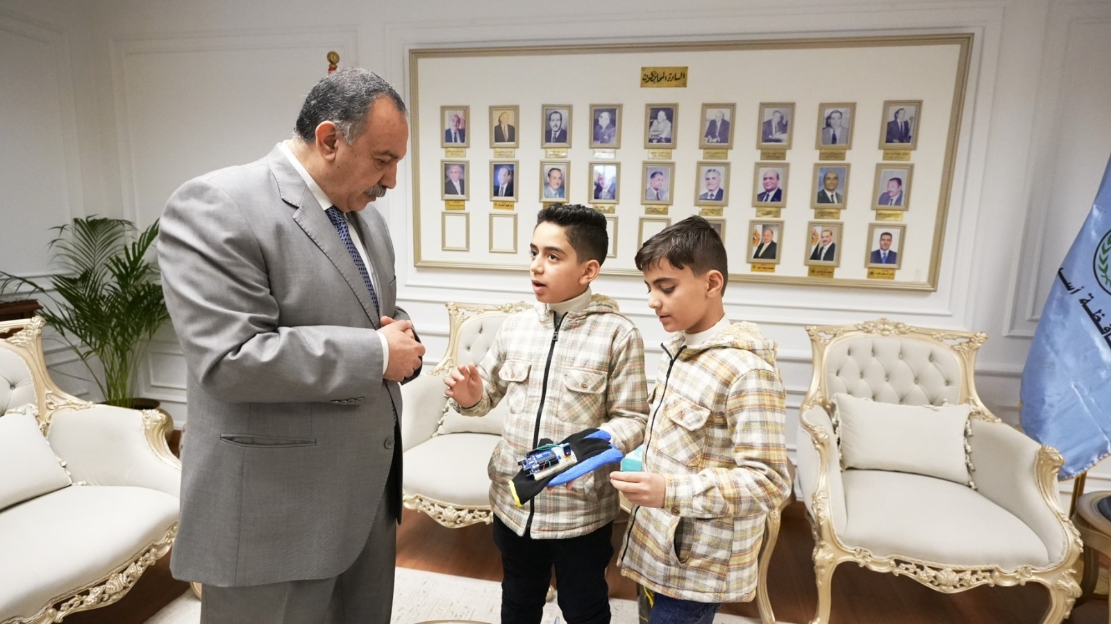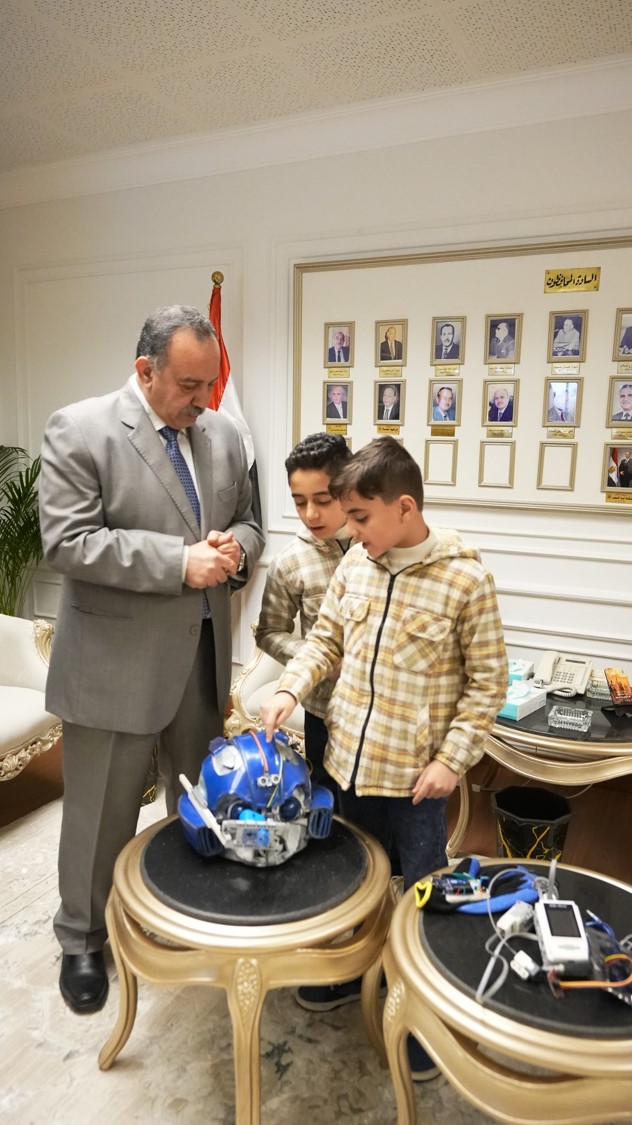 استقبل اللواء دكتور هشام أبو النصر، محافظ أسيوط، طالبين من المرحلة الابتدائية، يرافقهما المدربون القائمون على تدريبهم، وذلك تقديرًا لتميزهما في مجالات الروبوتات والبرمجة والذكاء الاصطناعي، في إطار حرص الدولة على دعم ورعاية النشء الموهوب، بحضور محمد إبراهيم دسوقي، وكيل وزارة التربية والتعليم.