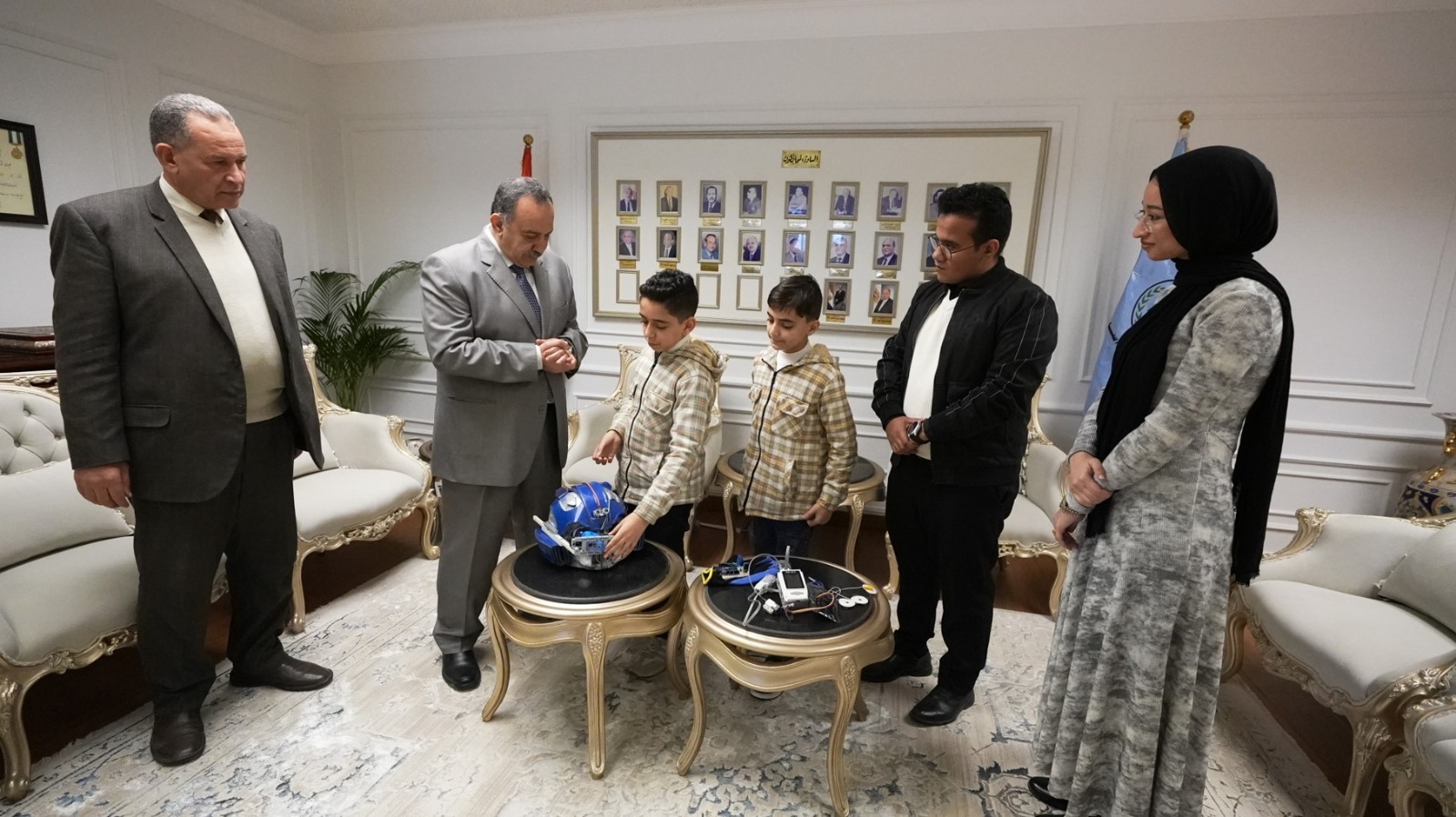 وخلال اللقاء، استعرض الطالب يوسف محمود سرور بالصف الخامس الابتدائي، والطالب يحيى محمود سرور بالصف الرابع الابتدائي بمدرسة دار الأقصى، مشروعهما الابتكاري المتمثل في اختراع «الخوذة الذكية»، الذي يهدف إلى خدمة عدد من المجالات الحيوية، من بينها أعمال الإطفاء، واستكشاف الفضاء، والتنقيب في المناجم، والعمل في البيئات الخطرة.