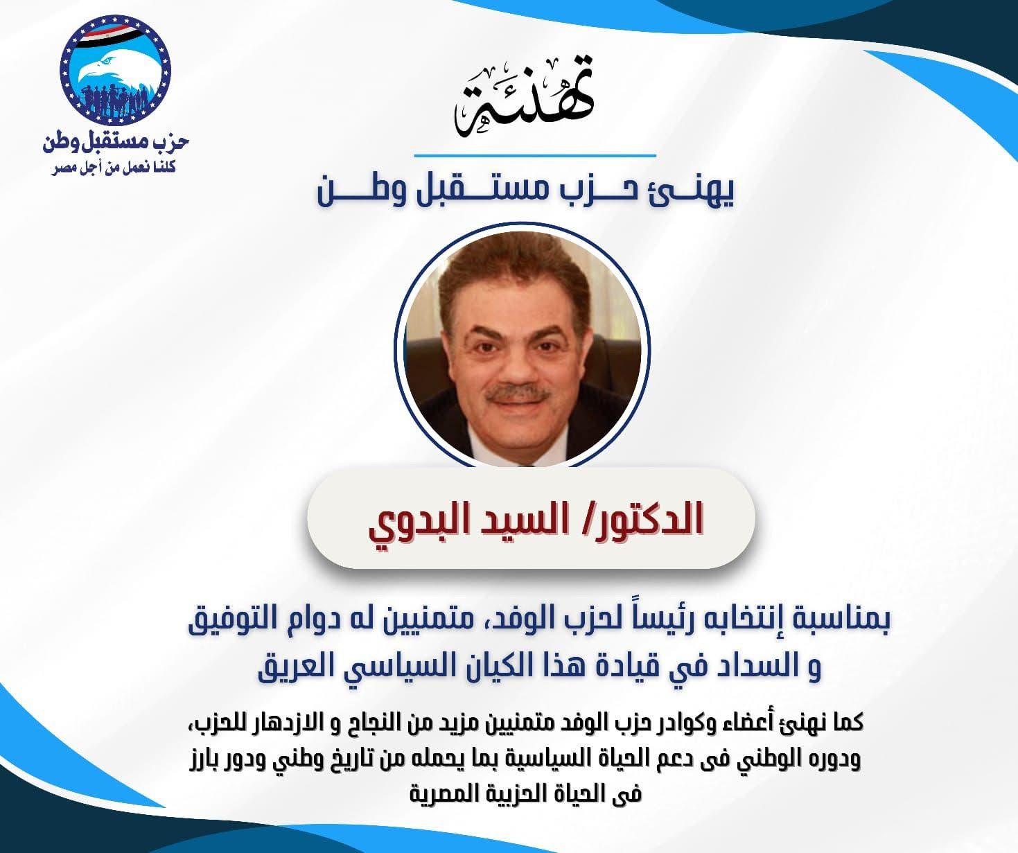 يهنئ حزب مستقبل وطن الدكتور السيد البدوي، بمناسبة انتخابه رئيسًا لحزب الوفد، متمنيًا له دوام التوفيق والسداد في قيادة هذا الكيان السياسي العريق.