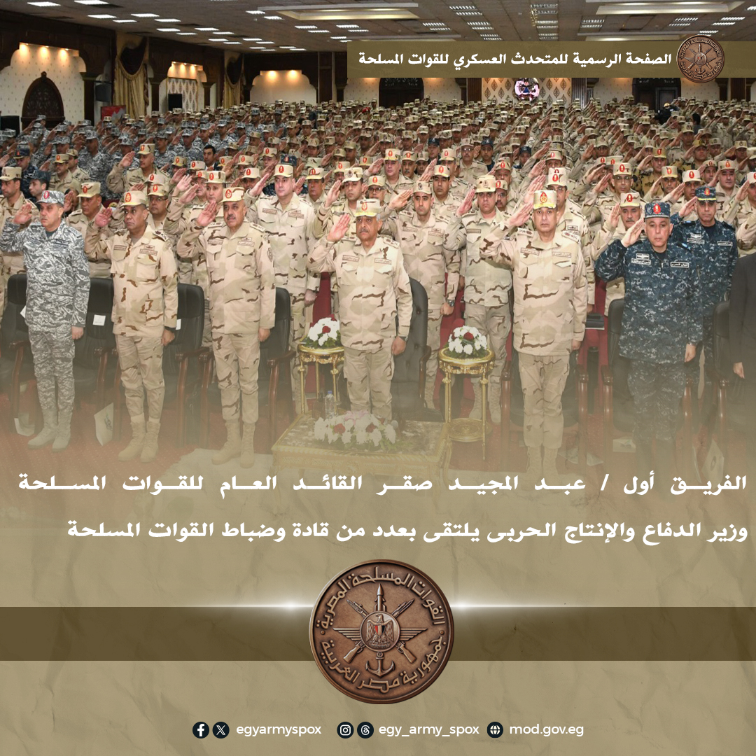 التقى الفريق أول عبدالمجيد صقر القائد العام للقوات المسلحة وزير الدفاع والإنتاج الحربي بعدد من قادة وضباط القوات المسلحة بقيادة المنطقة المركزية العسكرية، وذلك بحضور الفريق أحمد خليفة رئيس أركان حرب القوات المسلحة وقادة الأفرع الرئيسية وعدد من كبار قادة القوات المسلحة والذي يأتي في إطار المتابعة المستمرة لمنظومة العمل داخل القوات المسلحة ومناقشة أساليب تطوير الأداء بما يمكنها من الوفاء بالمهام والمسئوليات الوطنية لحماية الوطن وصون مقدساته.
