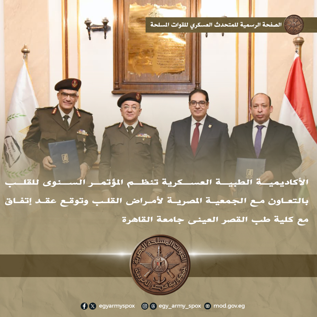 وفى سياق متصل، وقع اللواء طبيب طارق عبدالقادر سلام رئيس الأكاديمية الطبية العسكرية عقد اتفاق مع الدكتور حسام صلاح عميد كلية طب القصر العيني للتعاون بين الجانبين في تأهيل الأطباء من خلال دراسة الدبلومة المهنية لطب الكوارث والتي تهدف لإعداد كوادر طبية قادرة على التعامل مع الكوارث والأثار الناجمة عنها، وذلك بحضور اللواء طبيب محمد سعد حجازي مدير إدارة الخدمات الطبية للقوات المسلحة والدكتور محمـد سامي عبدالصادق رئيس جامعة القاهرة وعدد من قادة القوات المسلحة ومسؤولي جامعة القاهرة.