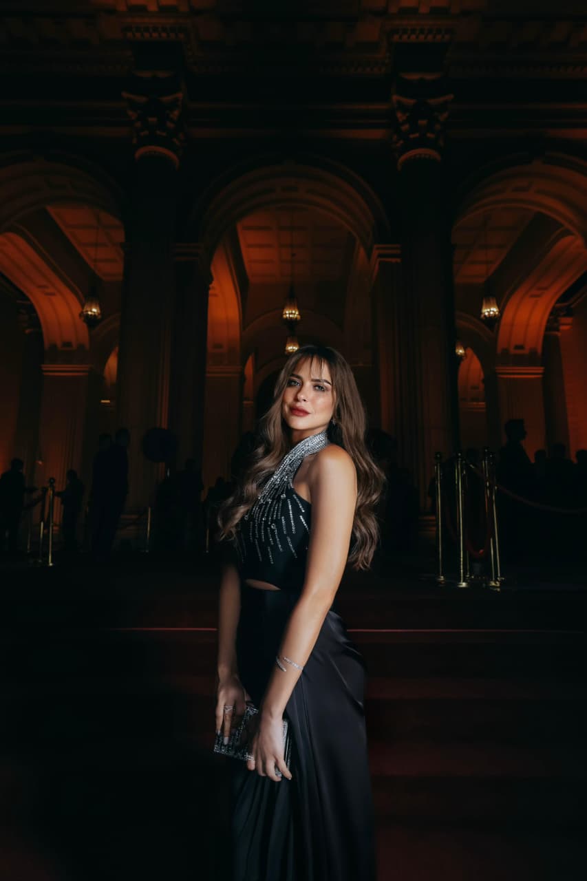 واختارت ريم مصطفى فستانًا أسود طويلاً بتصميم عصري، تميز بقصة أنثوية جذابة تجمع بين البساطة والفخامة، مع تفاصيل براقة عند منطقة الصدر أضفت لمسة من الرقي والتميز، بينما جاء التصميم منسدلًا بانسيابية أبرز رشاقتها ومنح الإطلالة طابعًا كلاسيكيًا أنيقًا، ونسّقت مع الفستان حقيبة يد صغيرة مرصعة، أكملت بها اللوك بسلاسة.