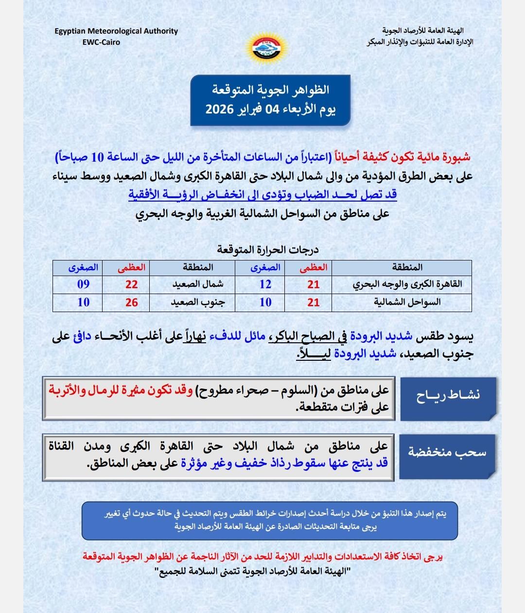 ويشهد الطقس نشاط رياح على مناطق من السلوم - صحراء مطروح) وقد تكون مثيرة للرمال والأتربة على فترات متقطعة، وسحب منخفضة على مناطق من شمال البلاد حتى القاهرة الكبرى ومدن القناة قد ينتج عنها سقوط رذاذ خفيف وغير مؤثرة على بعض المناطق.