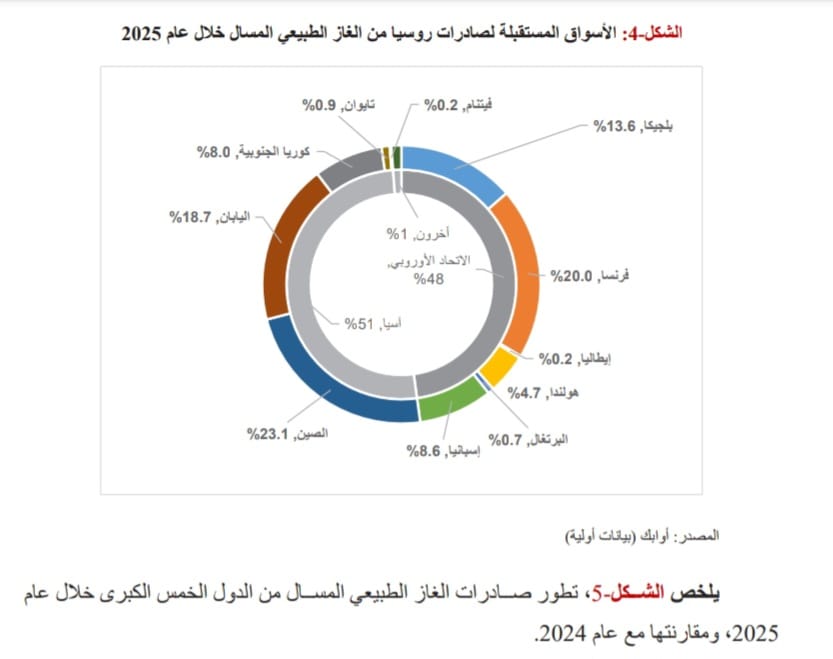 أما على صعيد الوجهات المستقبلة للغاز الطبيعي المسال من روسيا خلال عام 2025، فلا تزال تعتمد روسيا على سوق الاتحاد الأوروبي (27-EU) كوجهة رئيسية لتصريف صادراتها، حيث استحوذ على نحو 48% من إجمالي ما صدرته روسيا خلال عام 2025. ويتدفق الغاز الطبيعي المسال الروسي إلى أوروبا عبر الموانئ المنتشرة في فرنسا، وبلجيكا، وإسبانيا، وهولندا.