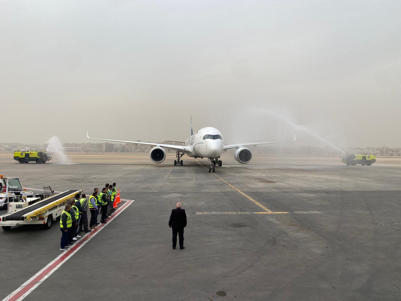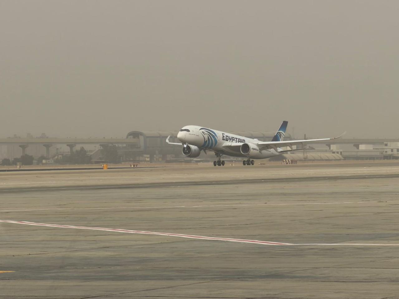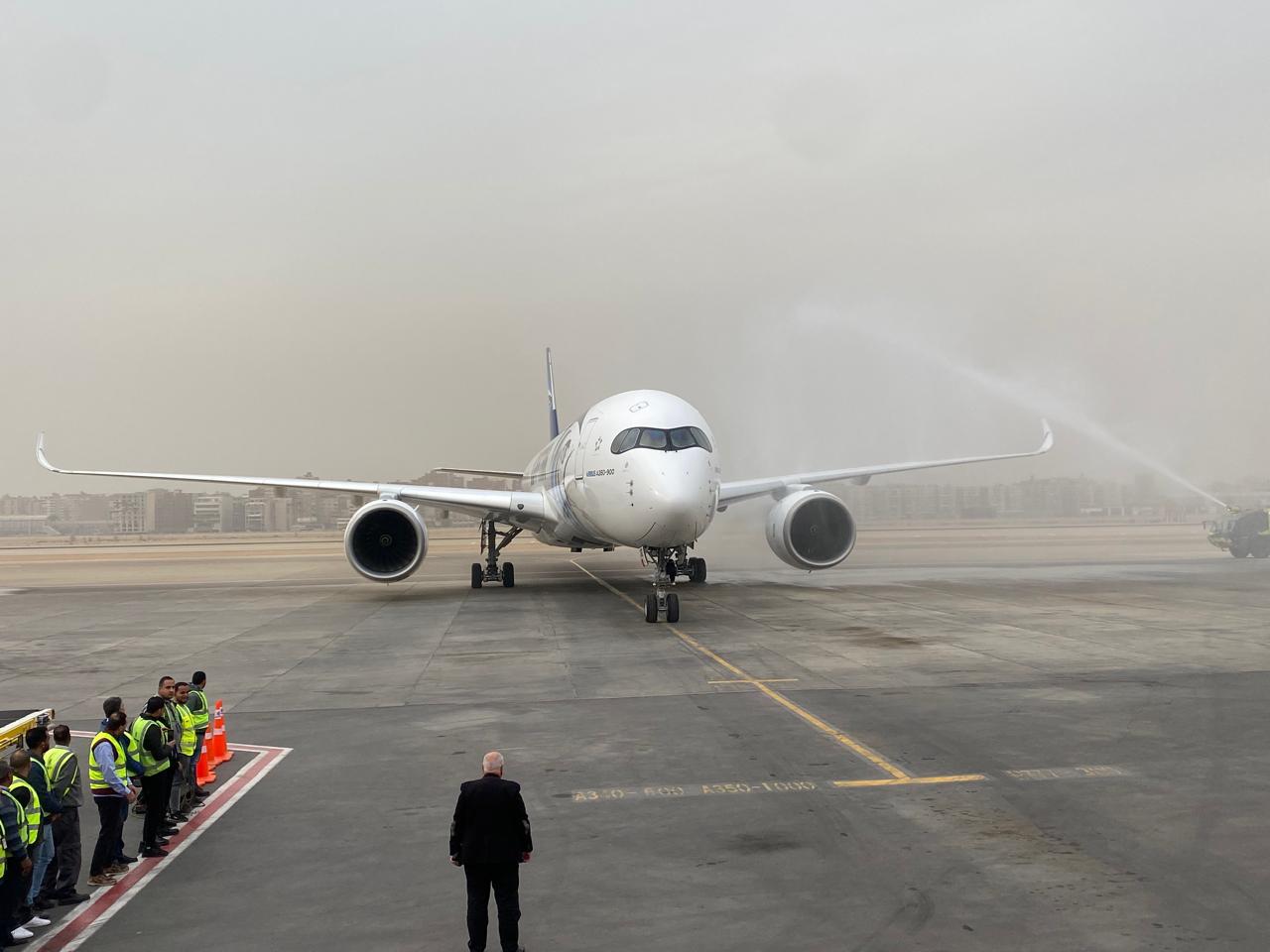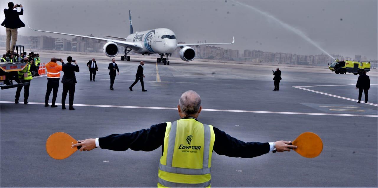 وصول أول طائرة لمصر للطيران من طراز الايرباصA350-900 إلى مطار القاهرة الدولي