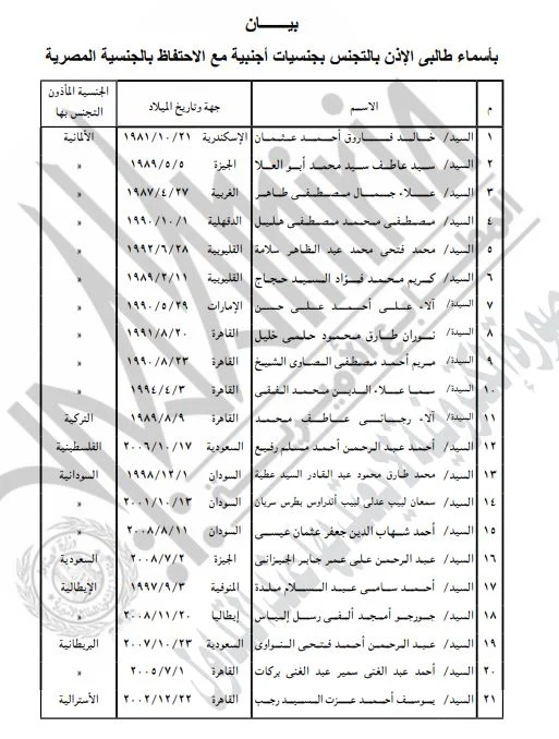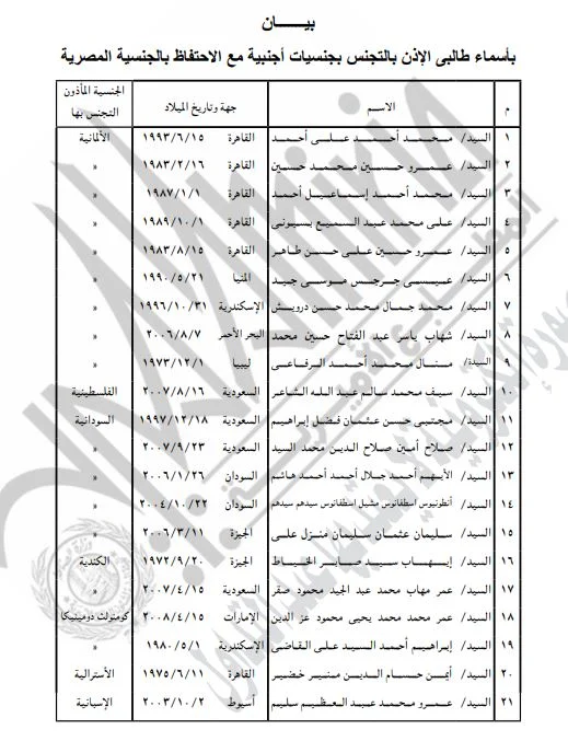 نشرت الجريدة الرسمية، قرار وزير الداخلية رقم 135 و136 لسنة 2026، بشأن منج الجنسية الأجنبية لـ42 مصريًا مع احتفاظهم بالجنسية المصرية، وذلك استنادًا إلى القانون رقم 26 لسنة 1975.