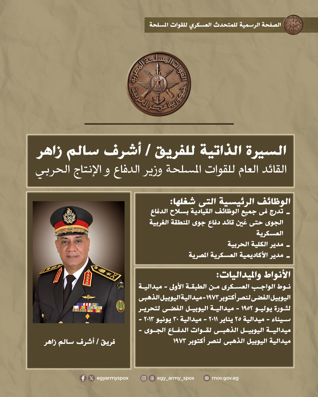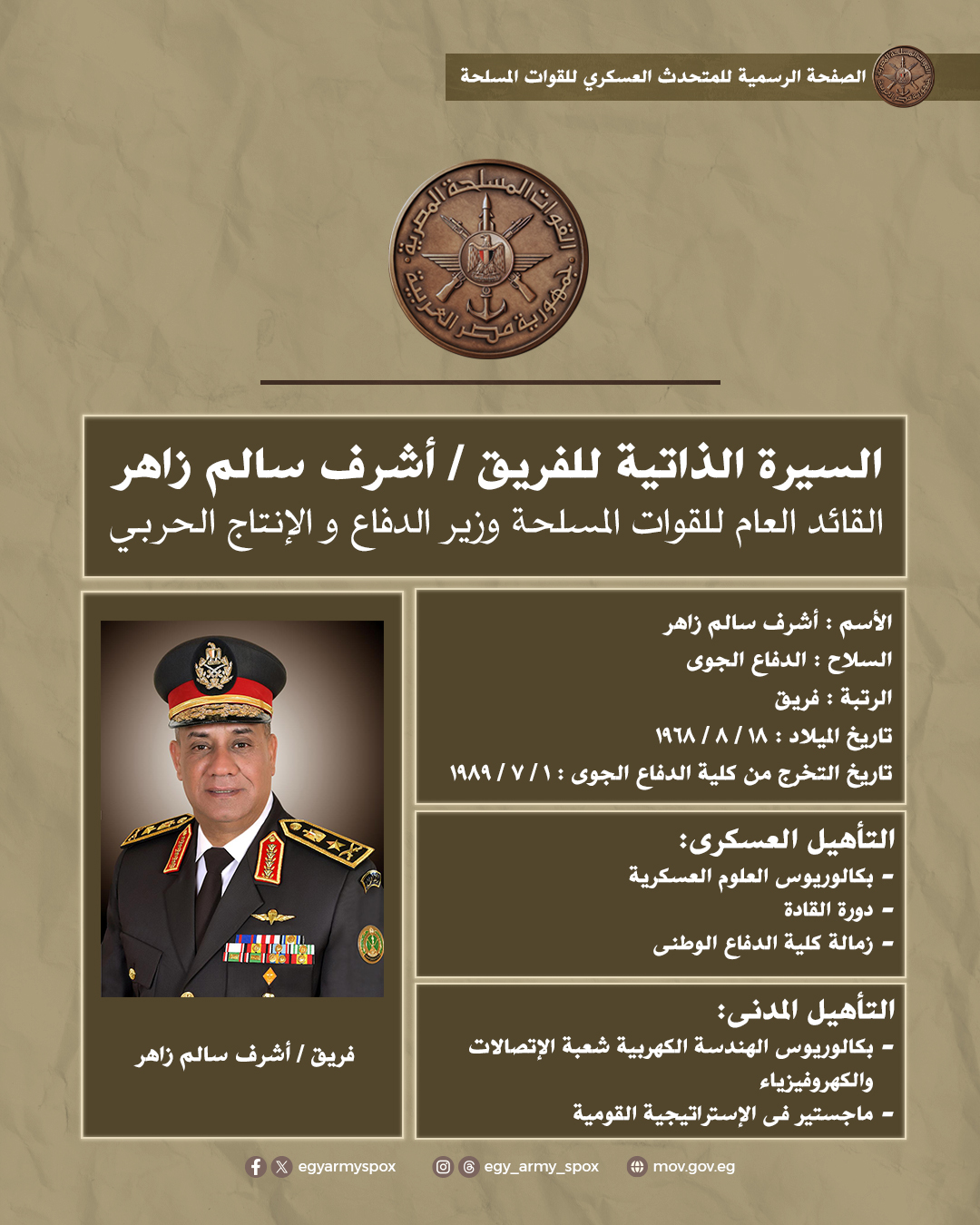 يمتلك الفريق أشرف سالم زاهر، القائد العام للقوات المسلحة وزير الدفاع والإنتاج الحربي، مسيرة حافلة بالعطاء داخل القوات المسلحة، حيث تدرج في جميع الوظائف القيادية بسلاح الدفاع الجوي، حتى عُين قائد دفاع جوي المنطقة الغربية العسكرية، ثم مدير الكلية الحربية، ثم مدير الأكاديمية العسكرية المصرية.
