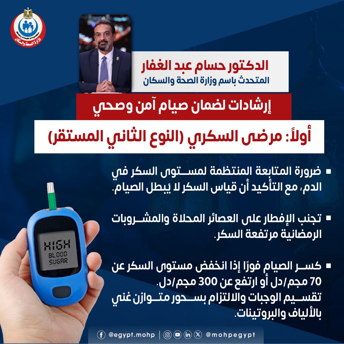 وجهت وزارة الصحة والسكان نصائح وإرشادات ضرورية لمرضى السكري (النوع الثاني المستقر) وذلك لضمان صيام آمن ومستقر وصحي، خلال شهر رمضان الكريم.