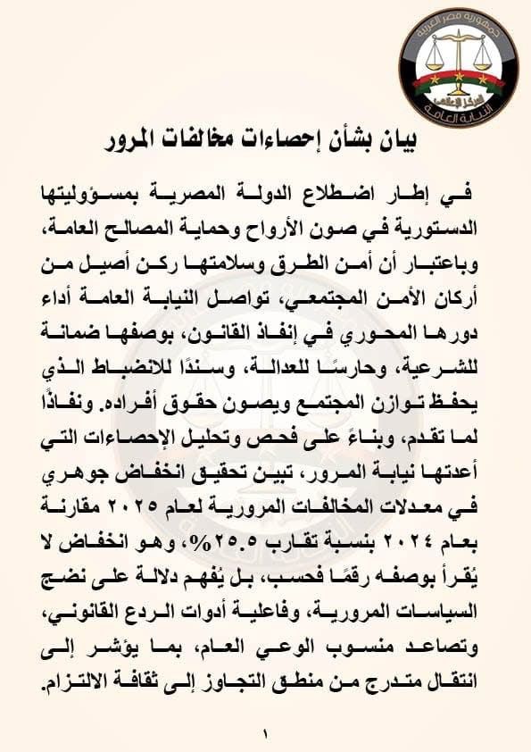 النيابة العامة: انخفاض جوهري في معدلات مخالفات المرور لعام 2025