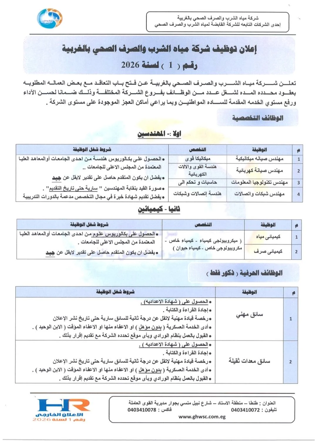 أصدرت شركة مياه الشرب والصرف الصحي بمحافظة الغربية، الإعلان رقم 1 لسنة 2026، بفتح باب التعاقد مع بعض العمالة المطلوبة بعقود محددة المدة لشغل عدد من الوظائف فى فروع الشركة المختلفة، لتحين الأداء ورفع مستوى الخدمة المقدمة للمواطنين.