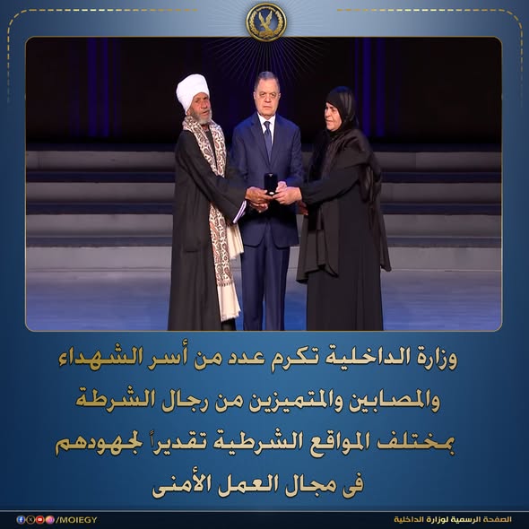 وأشار وزير الداخلية إلى أن تضحياتهم ستظل محل فخر واعتزاز لنا جميعاً ، كما أكد السيد/ الوزير على تقديره للجهود المتواصلة والمتفانية التى يبذلها أعضاء هيئة الشرطة بجميع المواقع الشرطية على مستوى الجمهورية، وأن تكريم أسر الشهداء والمصابين ونماذج من المتميزين من رجال الشرطة يُعد تكريماً لكافة أعضاء هيئة الشرطة.