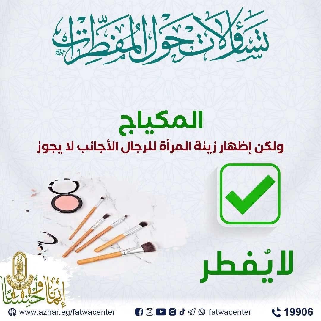 وأوضح الأزهر، عبر منشور توعوي نشره مركز الأزهر العالمي للفتوى الإلكترونية على منصاته الرسمية، أن استخدام المكياج في حد ذاته أمر مباح ولا يؤثر على صحة الصيام، مشيرًا إلى أن الحكم الشرعي يرتبط بطريقة استخدامه وحدود إظهار الزينة.