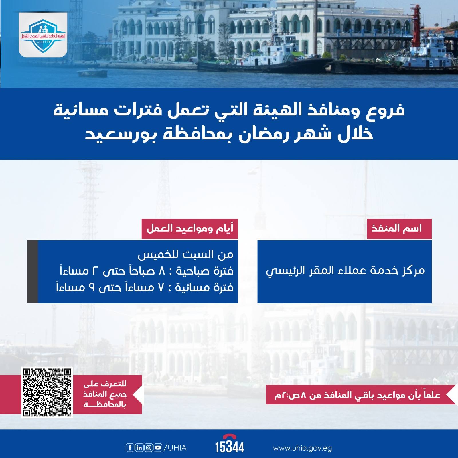 وأشارت الهيئة، أن محافظة بورسعيد سيعمل الفرع الرئيسي بها، من يوم السبت إلى الخميس خلال الفترتين الصباحية وأيضا المسائية وذلك لاستقبال المستفيدين خلال تلك الفترة وتقديم الخدمات المطلوبة لهم.