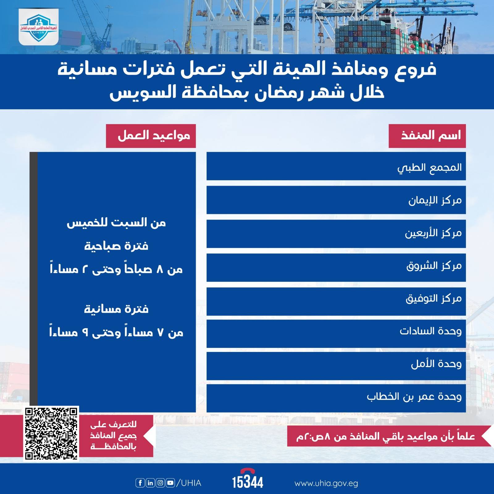 وفي هذا السياق، صرّحت مي فريد، المدير التنفيذي للهيئة العامة للتأمين الصحي الشامل، بأن الهيئة تسعى دائمًا إلى توفير خدماتها للمواطنين بأعلى جودة وأفضل كفاءة خلال شهر رمضان المبارك، وأشارت أن المواعيد الجديدة تأتي استجابة لاحتياجات المستفيدين، بما يضمن سهولة حصولهم على الخدمات الصحية دون أي عوائق.