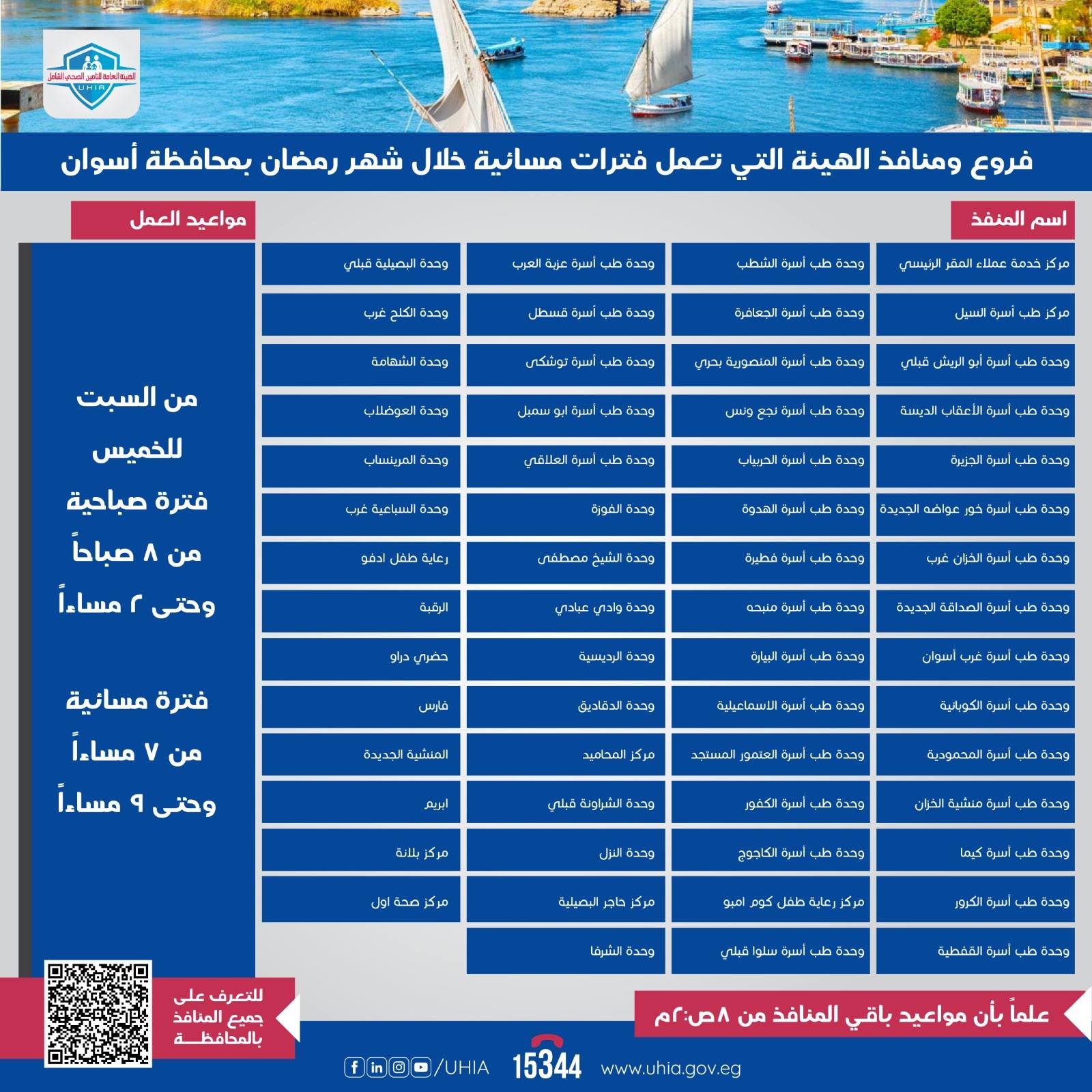 "مركز خدمة عملاء المقر الرئيسي، مركز طب أسرة السيل، وحدة طب أسرة أبو الريش قبلي، وحدة طب أسرة الأعقاب الديسة، وحدة طب أسرة الجزيرة، وحدة طب أسرة خور عواضه الجديدة، وحدة طب أسرة الخزان غرب، وحدة طب أسرة الصداقة الجديدة، وحدة طب أسرة غرب أسوان، وحدة طب أسرة الكوبانية، وحدة طب أسرة المحمودية، وحدة طب أسرة منشية الخزان، وحدة طب أسرة كيما، وحدة طب أسرة الكرور، وحدة طب أسرة القفطية، وحدة طب أسرة الشطب، وحدة طب أسرة الجعافرة، وحدة طب أسرة المنصورية بحري، وحدة طب أسرة نجع ونس، وحدة طب أسرة الحربياب، وحدة طب أسرة الهدوة، وحدة طب أسرة فطيرة، وحدة طب أسرة منبحه، وحدة طب أسرة البيارة، وحدة طب أسرة الاسماعيلية، وحدة طب أسرة العتمور المستجد، وحدة طب أسرة الكفور، وحدة طب أسرة الكاجوج، مركز رعاية طفل كوم امبو، وحدة طب أسرة سلوا قبلي، وحدة طب أسرة عزبة العرب، وحدة طب أسرة قسطل، وحدة طب أسرة توشكى، وحدة طب أسرة ابو سمبل، وحدة طب أسرة العلاقي، وحدة الفوزة، وحدة الشيخ مصطفى، وحدة وادي عبادي، وحدة الرديسية، وحدة الدقاديق، مركز المحاميد، وحدة الشراونة قبلي، وحدة النزل، مركز حاجر البصيلية، وحدة الشرفا، وحدة البصيلية قبلي، وحدة الكلح غرب، وحدة الشهامة، وحدة العوضلاب، وحدة المرينساب، وحدة السباعية غرب، رعاية طفل ادفو، الرقبة، حضري دراو، فارس، المنشية الجديدة، ابريم، مركز بلانة، ومركز صحة أول".