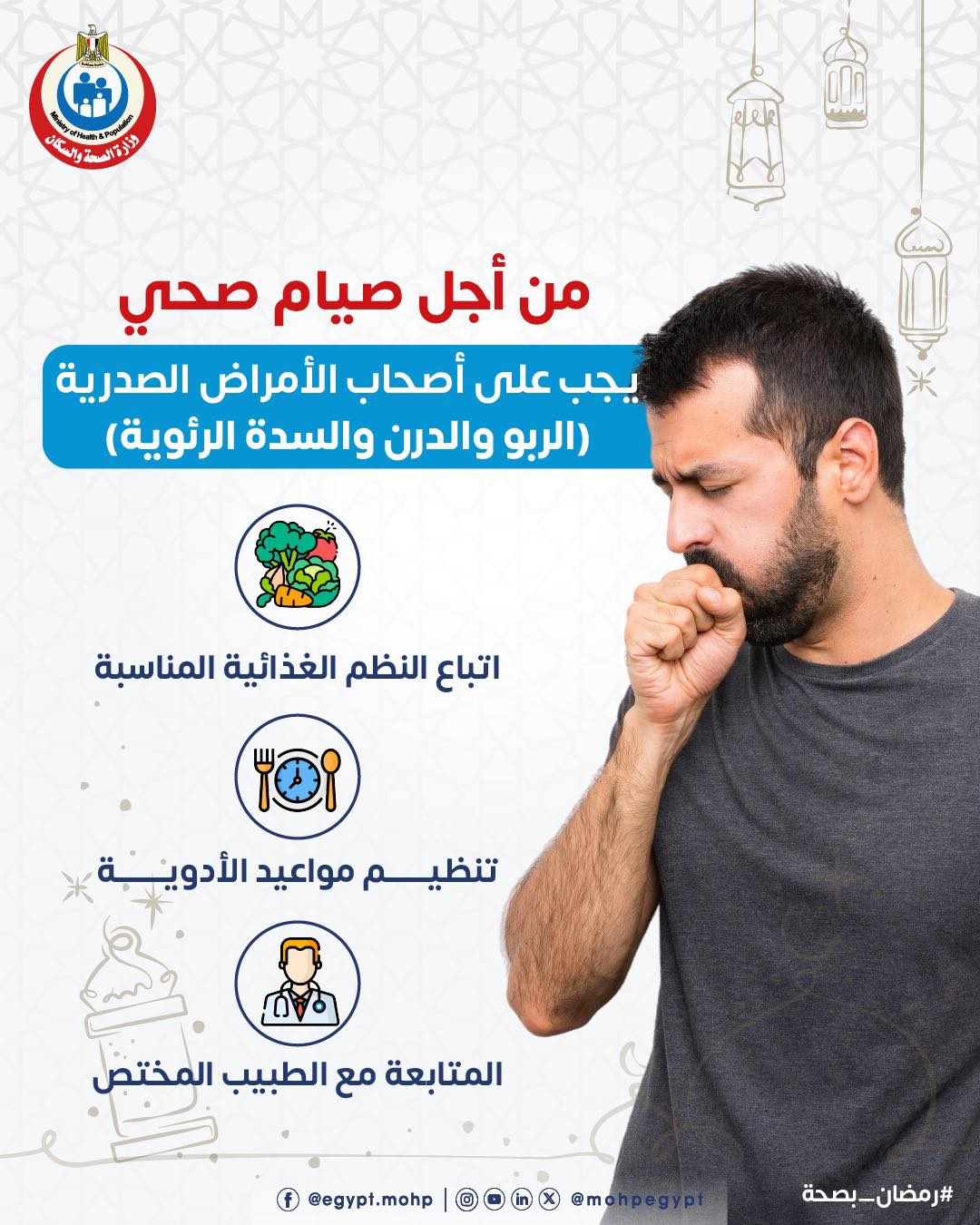 وجهت وزارة الصحة والسكان نصائح وإرشادات ضرورية لأصحاب الأمراض الصدرية (الربو - الدرن - السدة الرئوية)؛ من أجل صيام صحي، وتجنب حدوث مضاعفات مرضية.