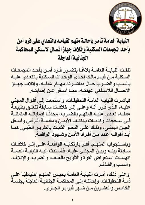 تلقت النيابة العامة بلاغًا بتضرر فرد أمن بأحد المجمعات السكنية من قيام مالك إحدى الوحدات السكنية بالتعدي عليه بالسب والضرب حال مباشرته مهام عمله، وإتلاف جهاز الاتصال اللاسلكي عهدته، مما أسفر عن إصابته.
