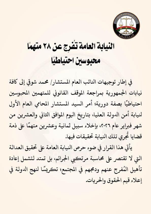 في إطار توجيهات النائب العام المستشار محمد شوقي إلى كافة نيابات الجمهورية بمراجعة الموقف القانوني للمتهمين المحبوسين احتياطيًا بصفة دورية أمر المستشار المحامي العام الأول لنيابة أمن الدولة العليا، بتاريخ اليوم الموافق الثاني والعشرين من شهر فبراير عام ٢٠٢٦، بإخلاء سبيل ثمانية وعشرين متهمًا على ذمة قضايا تجري تلك النيابة تحقيقات فيها.