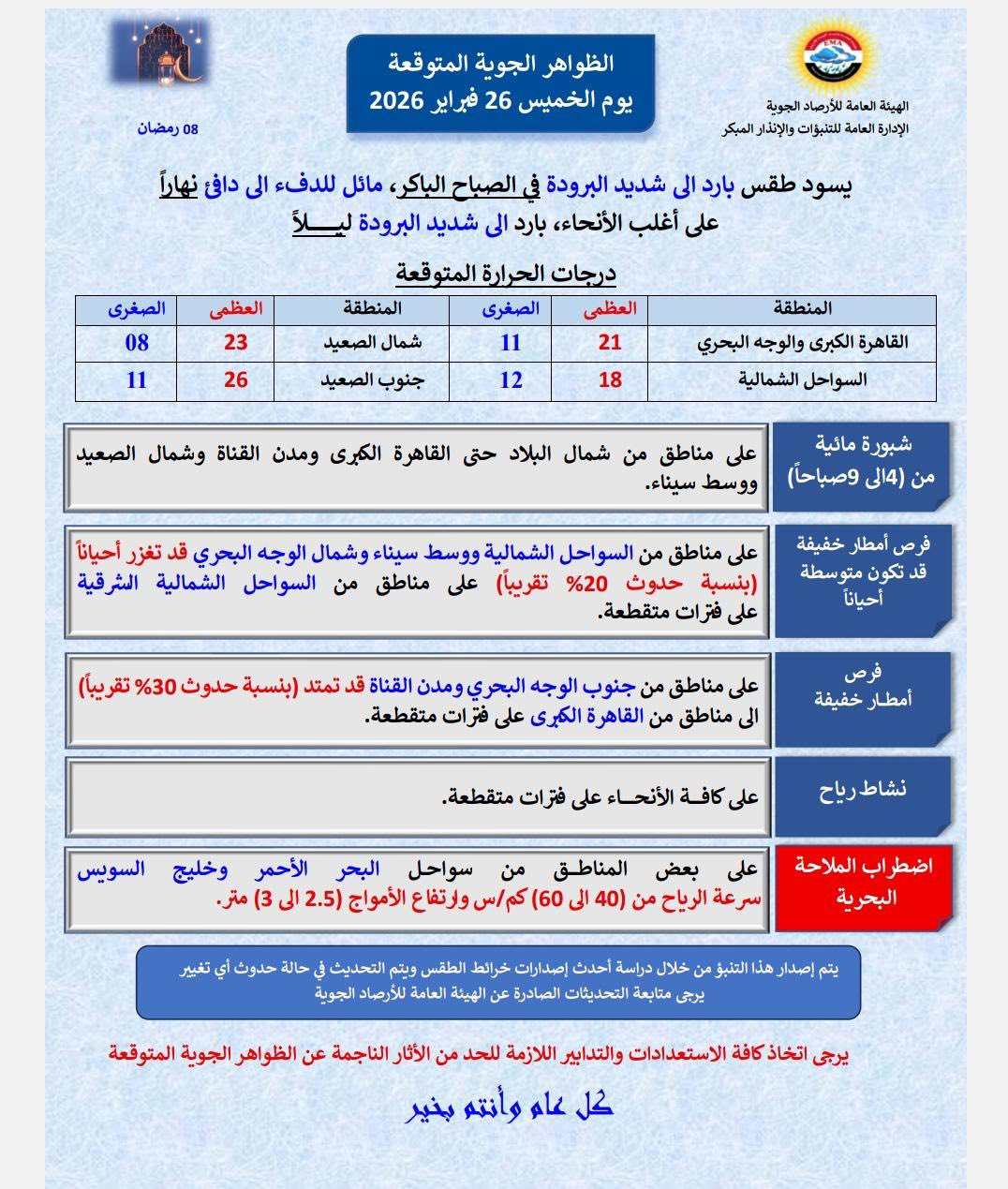 أعلنت الهيئة العامة لـ الأرصاد الجوية تفاصيل حالة الطقس المتوقعة اليوم الخميس، محذرة من أجواء باردة إلى شديدة البرودة صباحًا، تميل للاعتدال نهارًا، مع نشاط للرياح وفرص لسقوط أمطار متفاوتة الشدة على عدد من المناطق، واضطراب في حركة الملاحة البحرية.