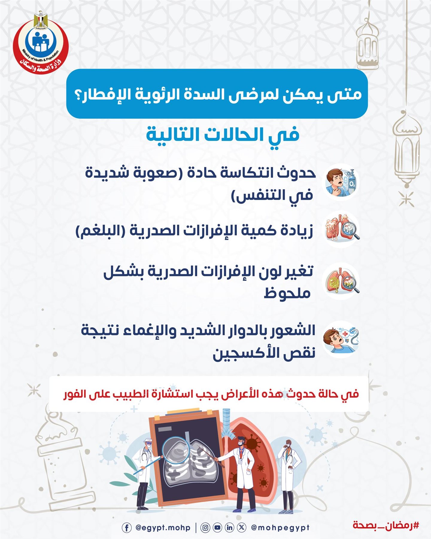 كشفت وزارة الصحة والسكان، عن حالات يُمكن لمرضى السدة الرئوية الإفطار فيها، خلال شهر رمضان المبارك، وذلك لتجنب حدوث مضاعفات مرضية تعرض المريض للخطر.