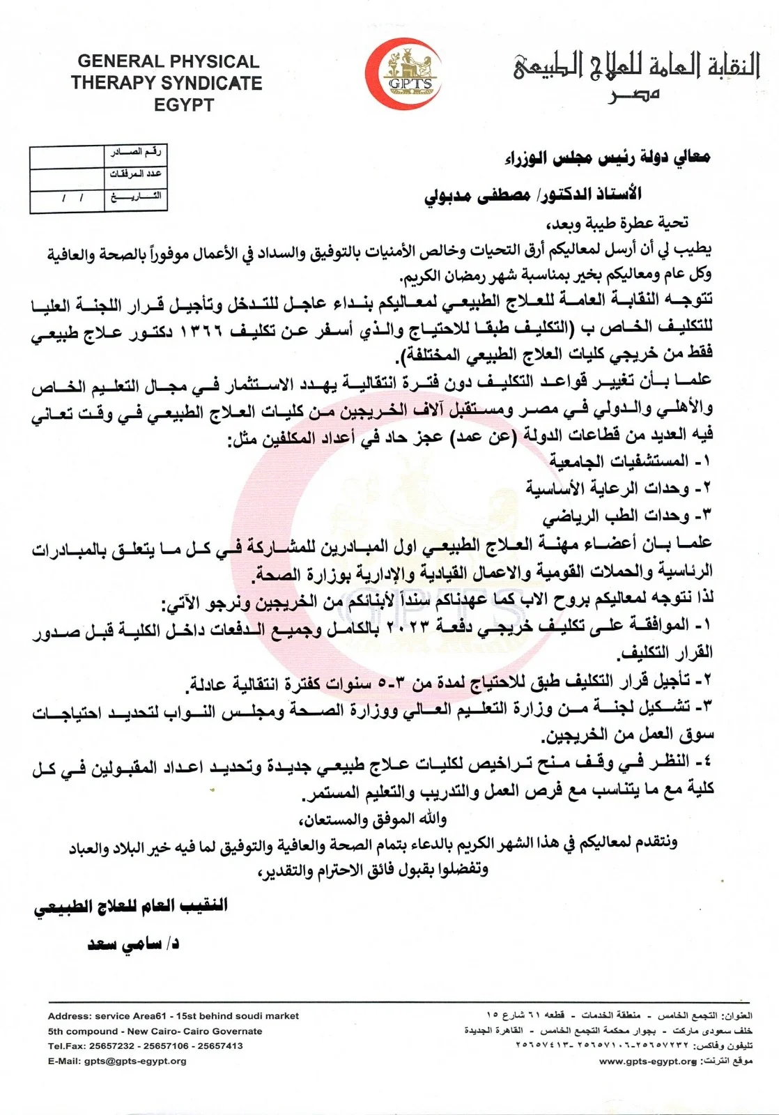 خاطب الدكتور سامي سعد، النقيب العام للعلاج الطبيعي، الدكتور مصطفى مدبولي رئيس مجلس الوزراء، بمطلب عاجل للتدخل لإعادة النظر في القواعد الجديدة لتكليف خريجي كليات العلاج الطبيعي، والتي قصرت التكليف على "الاحتياج" فقط، مما أسفر عن تكليف 1366 خريجا فقط من إجمالي أعداد الخريجين من دفعة 2023.