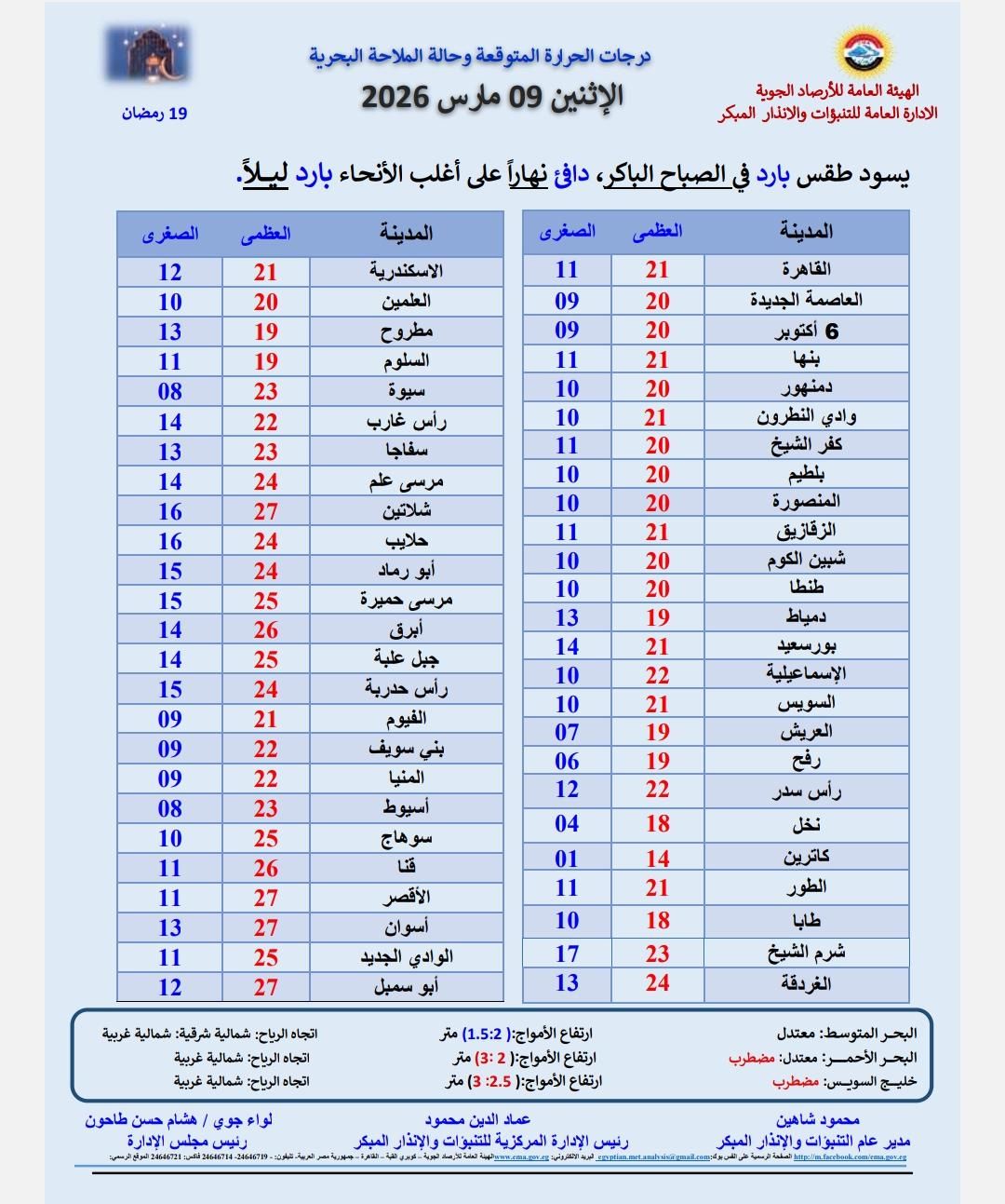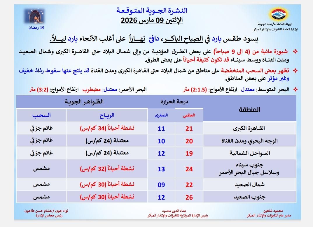تتوقع الهيئة العامة للأرصاد الجوية، أن يشهد غدًا الإثنين 9- 3- 2026، طقس بارد في الصباح الباكر، دافئ نهارًا على أغلب الأنحاء بارد ليلاً.