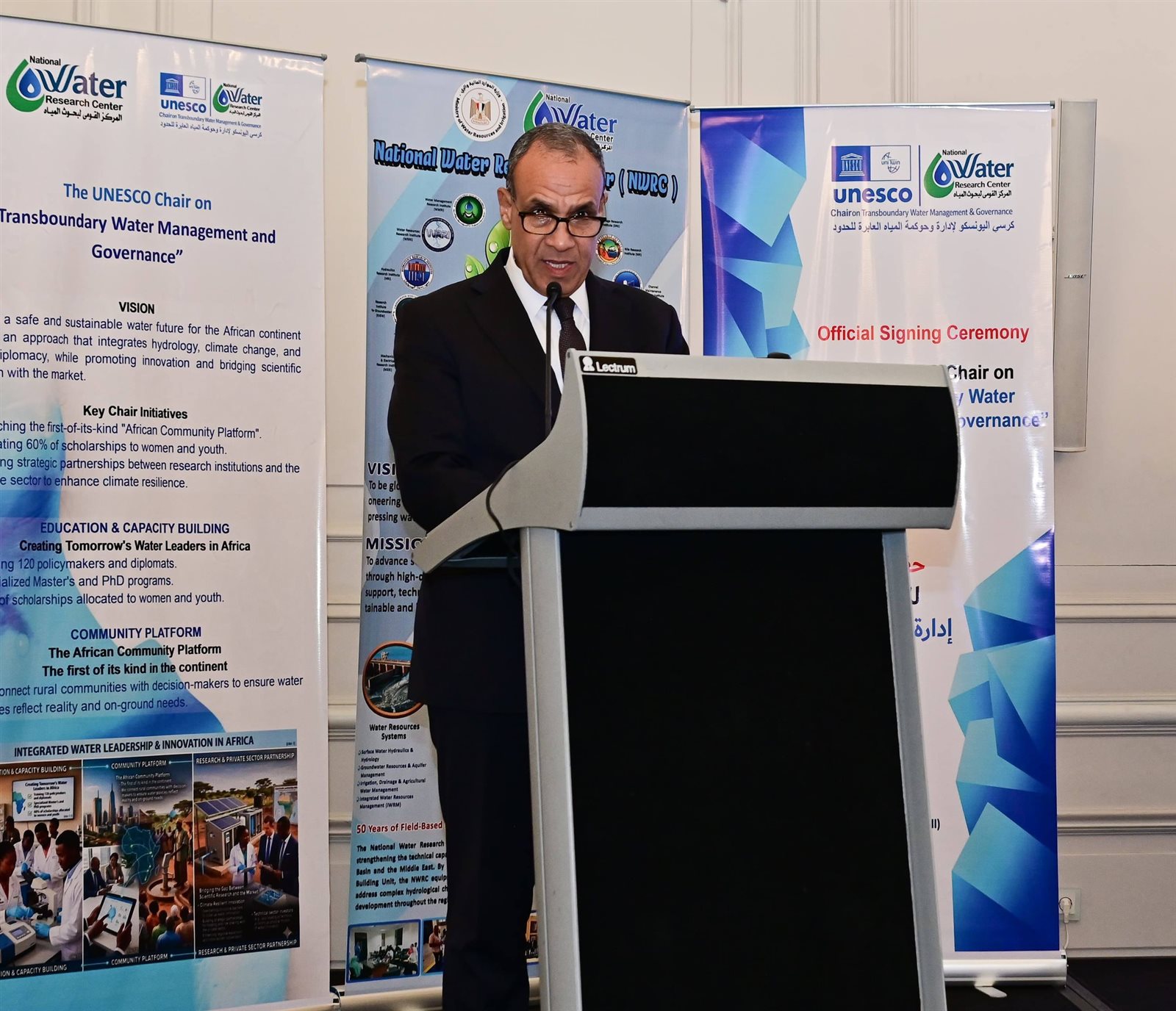 وفي كلمته، أكد الدكتور شريف محمدي، رئيس المركز القومي لبحوث المياه، أن استضافة المركز لهذا الكرسي يُمثل خطوة مهمة لتعزيز البحث العلمي والتعاون الدولي لمواجهة تحديات المياه في إفريقيا، مُشيرًا إلى أن المركز بما يمتلكه من خبرات علمية وبنية بحثية متقدمة سيعمل على تطوير أدوات علمية لدعم متخذي القرار وتعزيز الإدارة المستدامة للموارد المائية، مع توسيع الشراكات مع المنظمات الدولية ومراكز البحث والقطاع الخاص لدعم الابتكار وتحقيق الأمن المائي الإقليمي.