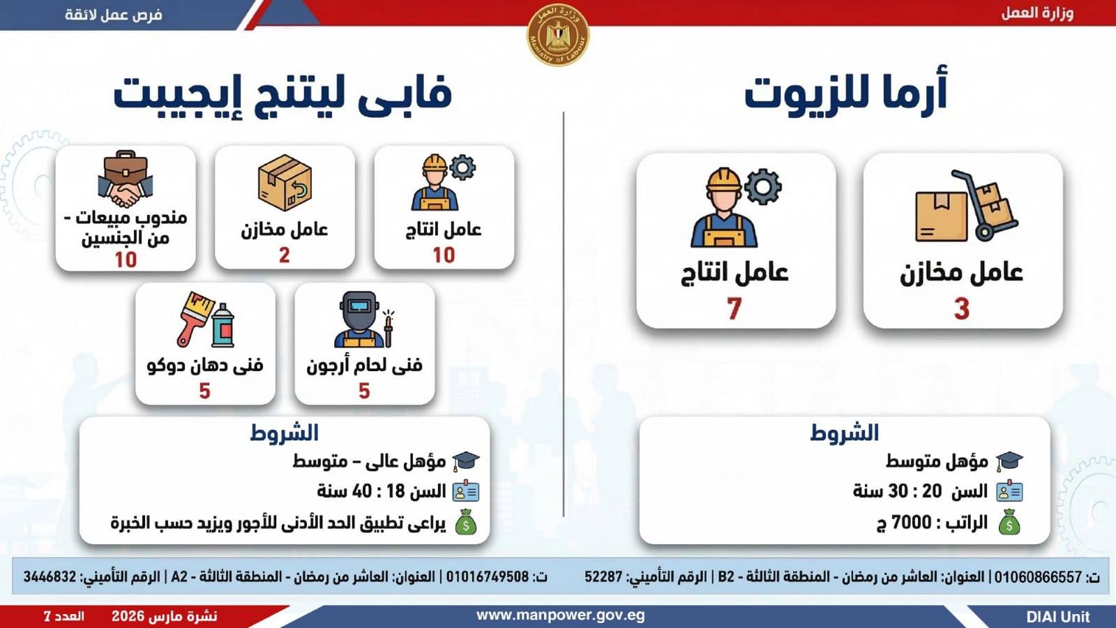 تتضمن أحدث الفرص المتوفرة على مستوى الجمهورية، نتاج تعاون مشترك بين مديريات العمل والقطاع الخاص بالمحافظات.