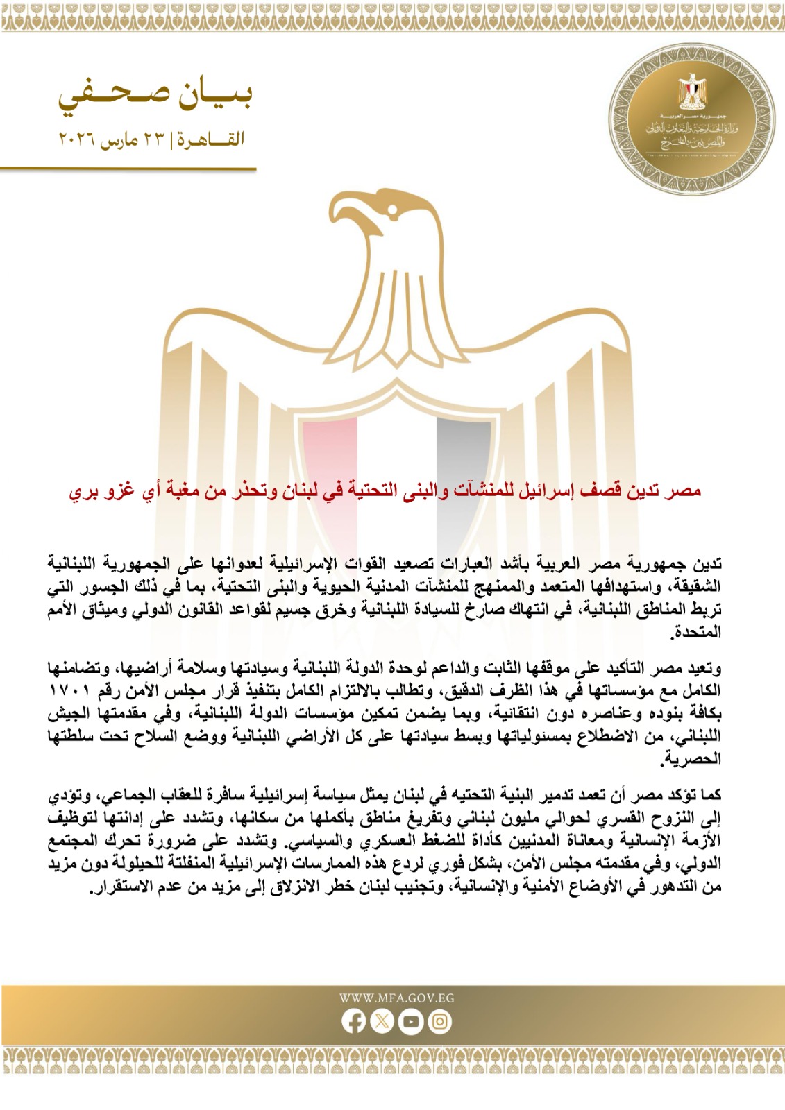 كما أكدت مصر أن تعمد تدمير البنية التحتيه في لبنان يمثل سياسة إسرائيلية سافرة للعقاب الجماعي، وتؤدي إلى النزوح القسري لحوالي مليون لبناني وتفريغ مناطق بأكملها من سكانها، وتشدد على إدانتها لتوظيف الأزمة الإنسانية ومعاناة المدنيين كأداة للضغط العسكري والسياسي.