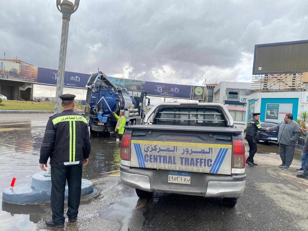 كما تم التنسيق مع الجهات المعنية للدفع بسيارات شفط المياه في أماكن تجمعات الأمطار، لضمان عدم تأثر السيولة المرورية، خاصة بالمناطق الحيوية والطرق السريعة.