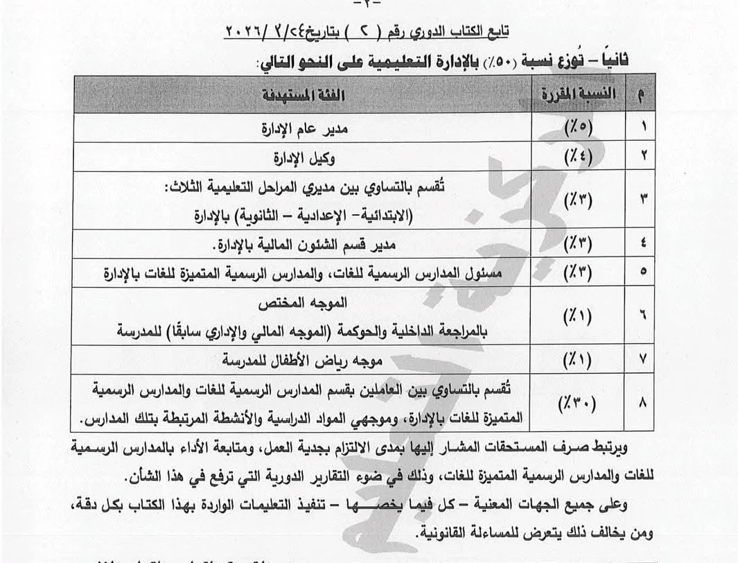 والتي تنص على أن: 90% تصرف كمكافآت جهود غير عادية لجميع العاملين بإدارة المدارس الرسمية للغات والمدارس الرسمية المتميزة للغات بالمديرية التعليمية، ومسئولي إدارة المدارس الرسمية للغات والمدارس الرسمية المتميزة للغات في الإدارات التابعة لها، على أن تعامل بنسبة 100% ويتم توزيعها كالآتي: