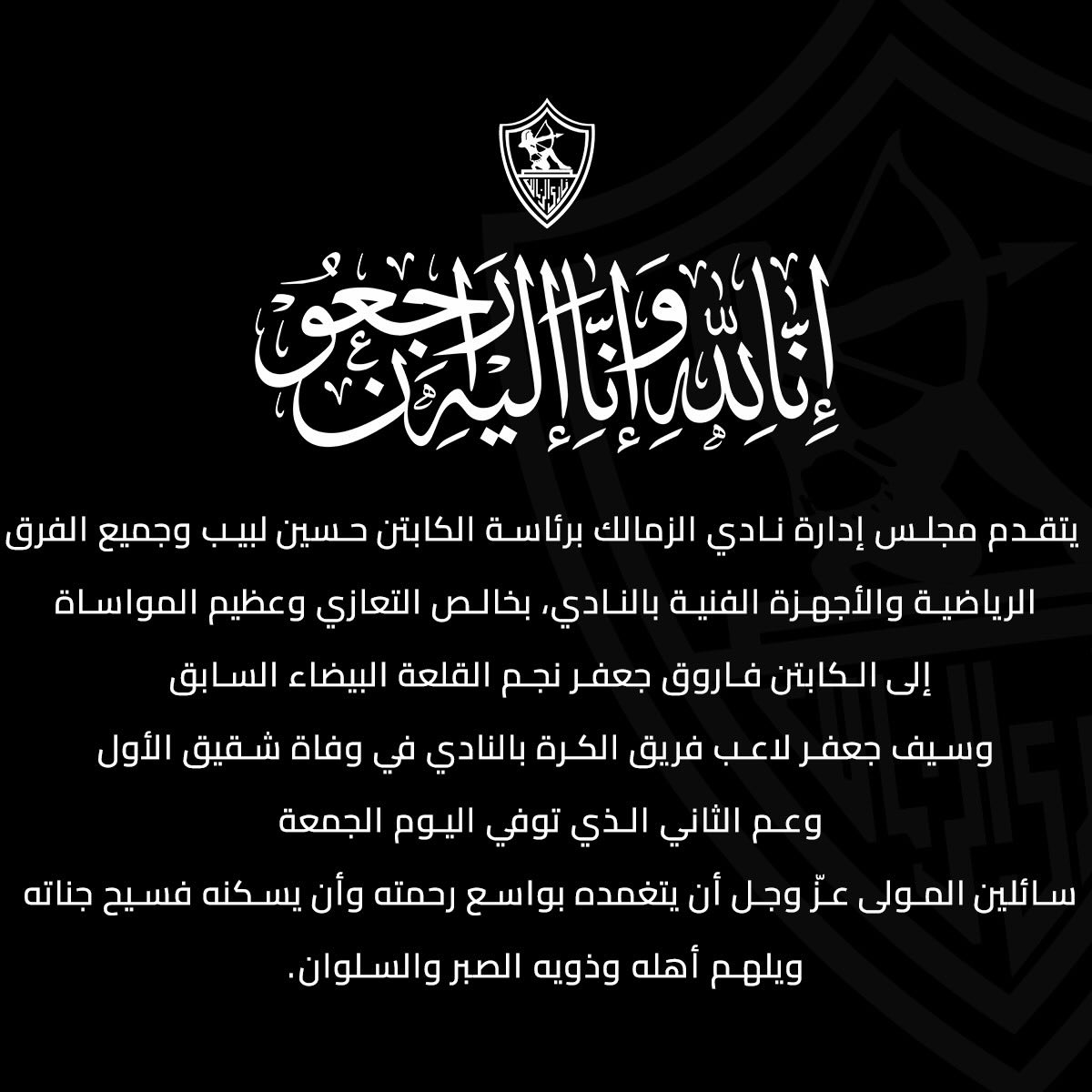 يتقدم مجلس إدارة نادي الزمالك، برئاسة الكابتن حسين لبيب، وجميع الفرق الرياضية والأجهزة الفنية بالنادي، بخالص التعازي وعظيم المواساة إلى الكابتن فاروق جعفر، نجم القلعة البيضاء السابق، وسيف جعفر، لاعب فريق الكرة بالنادي، في وفاة شقيق الأول، وعم الثاني الذي توفي اليوم الجمعة.