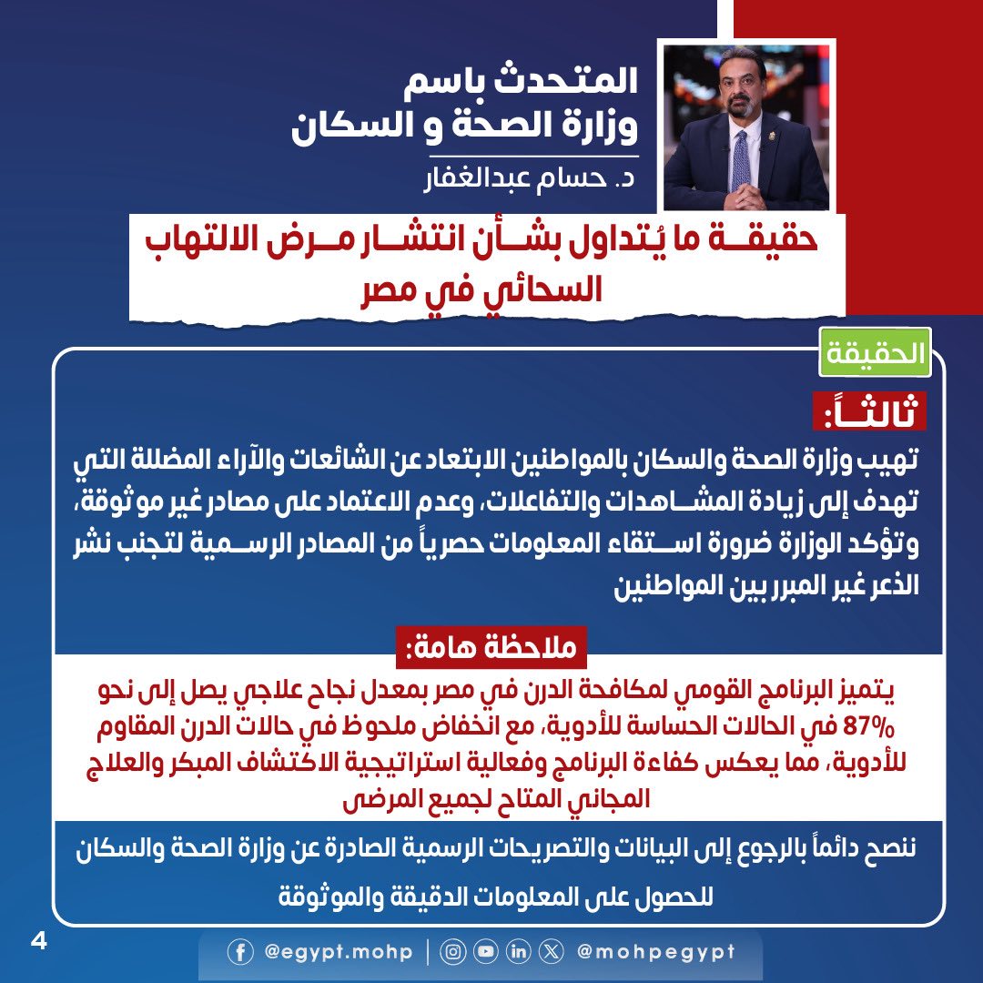 وناشدت وزارة الصحة المواطنين بعدم الانسياق وراء الشائعات أو المعلومات غير الدقيقة، والاعتماد فقط على المصادر الرسمية للحصول على المعلومات الصحيحة، تجنبًا لإثارة القلق غير المبرر.