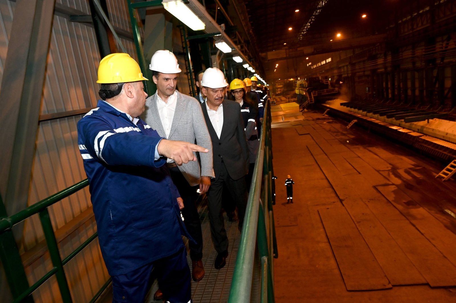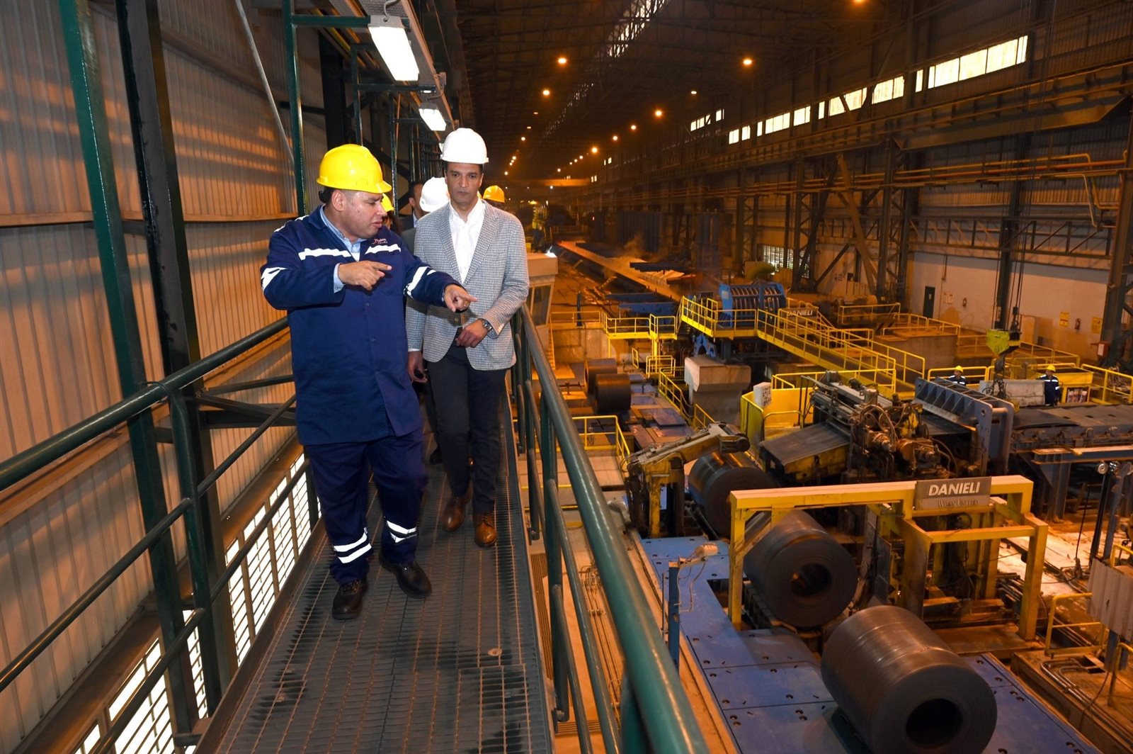 وخلال الزيارة تفقد الوزير مصنع الاختزال، ومنطقة الأفران والماكينات، ومراحل درفلة الصلب المسطح وصولاً للمنتج النهائي.