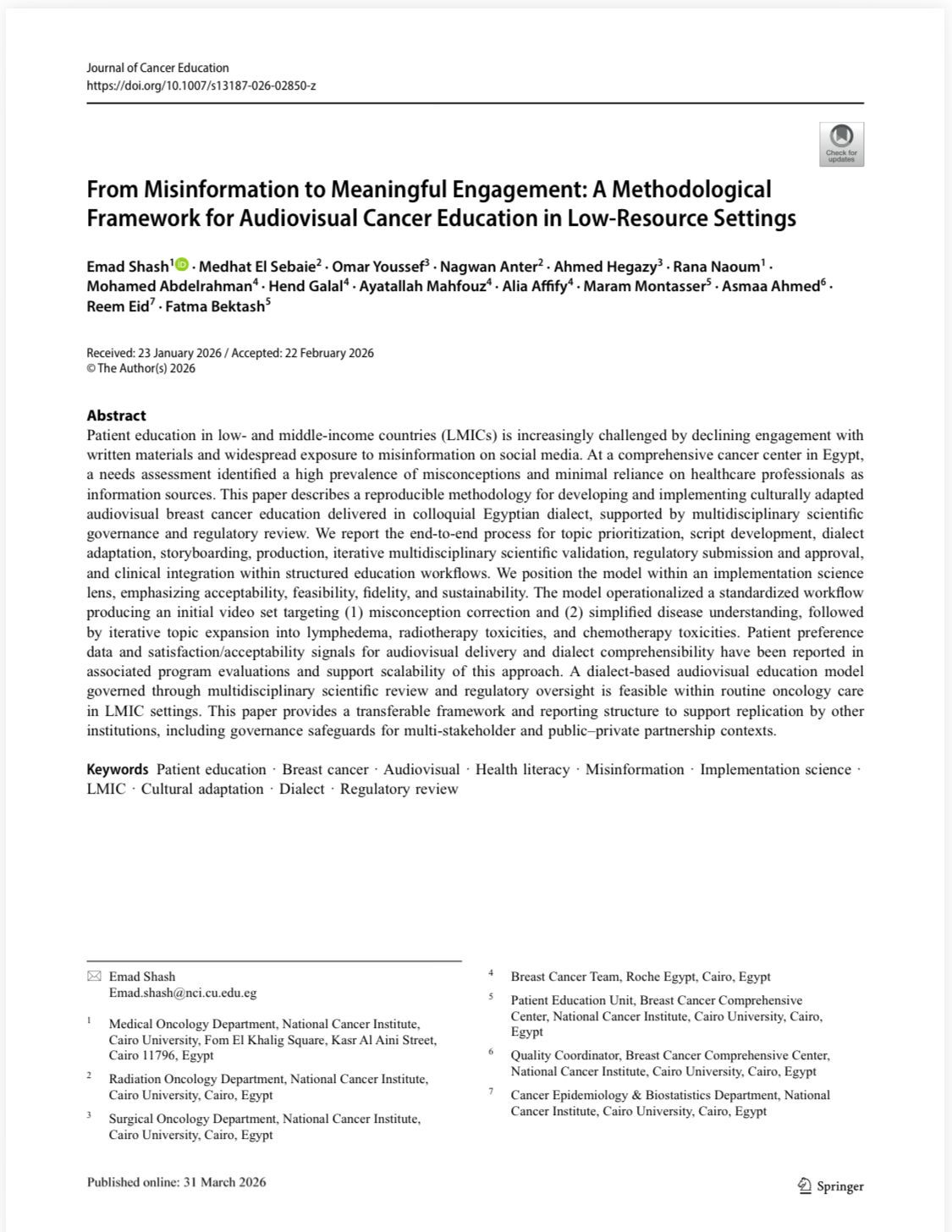 ومن جانبه، أوضح الدكتور محمد عبدالمعطي سمرة، عميد المعهد القومي للأورام، أن هذا النشر العلمي يعكس التزام المعهد بتطوير نماذج متكاملة للرعاية، تجمع بين العلاج المتخصص والبحث العلمي والتثقيف الصحي الفعال، خاصة في مجال سرطان الثدي، مشيرًا إلى أن الدراسة اعتمدت على تقديم محتوى مبسط عبر فيديوهات قصيرة باللغة القريبة من المرضى، بما يسهم في تقليل الخوف وتعزيز الثقة في المعلومات الطبية.